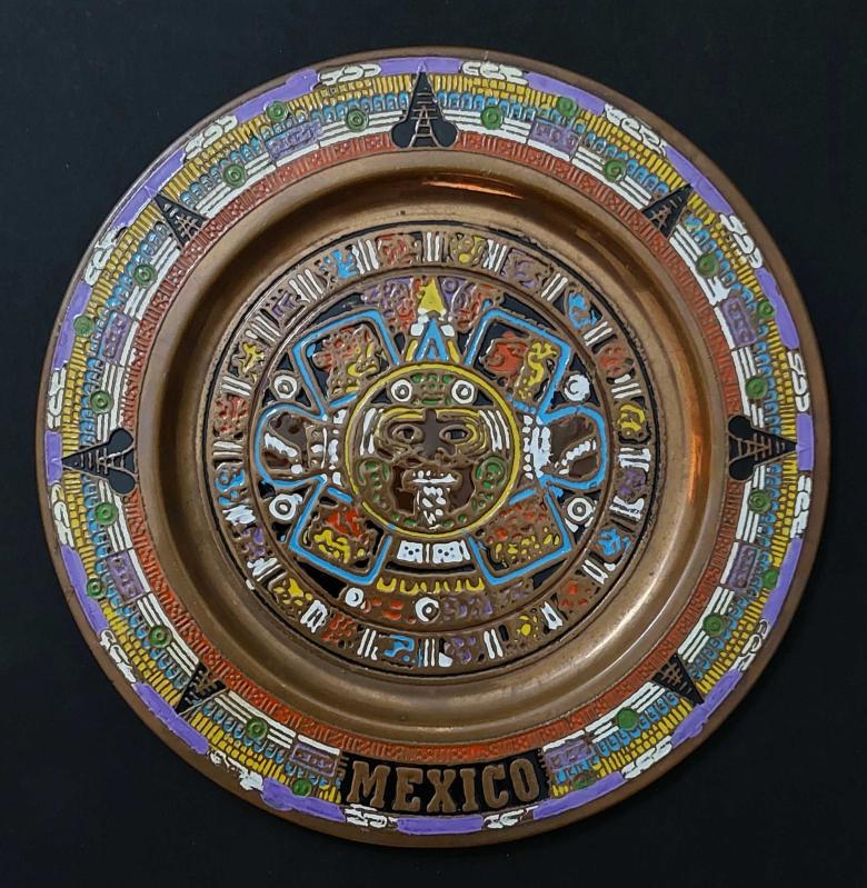 Meksika, Maya Takvimi Temalı Bakır Levha Tabak/Mexico. 1998. Renkli Mineli, Mükemmel Meksika (Antik Maya) Sanatı. El İşçiliği İle Boyama. Ayakta Sergilemeye Uygundur. Cu/Bakır (16,3 cm) başlıklı antika/koleksiyon objesinin menşei belirtilmemiştir. 1980-1999 arası dönemine aittir.