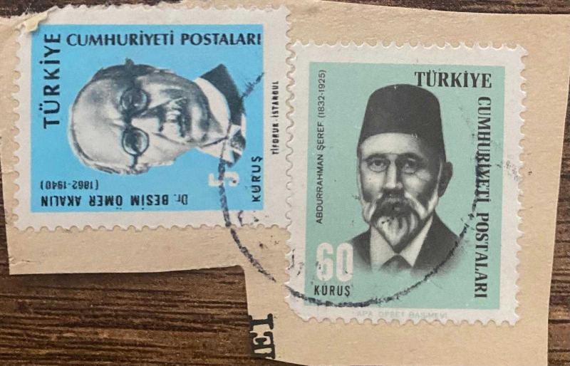 Mektup Zarfından Kesilmiş / Postadan Geçmiş İkili Pul Filateli - Damgalı - ABDURRAHMAN ŞEREF, 60 KURUŞ / DR. ÖMER BESİM AKALIN, 5 KURUŞ / - Türkiye Cumhuriyeti