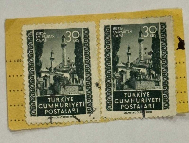 Mektup Zarfından Kesilmiş / Postadan Geçmiş İkili Pul Filateli - Damgalı -BURSA EMİRSULTAN CAMİİ - 30 KURUŞ - Türkiye Cumhuriyeti, en son 1 yıl önce güncellenmiştir.