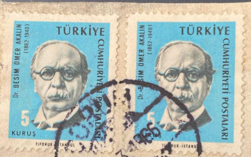 Mektup Zarfından Kesilmiş / Postadan Geçmiş İkili Pul Filateli - Damgalı - DR. BESİM ÖMER AKALIN , 5 KURUŞ - Türkiye Cumhuriyeti, en son 1 yıl önce güncellenmiştir.