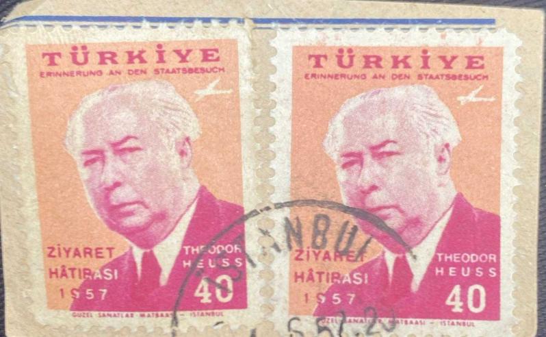 Mektup Zarfından Kesilmiş / Postadan Geçmiş İkili Pul Filateli - Damgalı İstanbul - THEODOR HEUSS ZİYARET HATIRASI 1957 , 40 PARA - Türkiye Cumhuriyeti, 1 yıl önce satışa sunulmuştur.