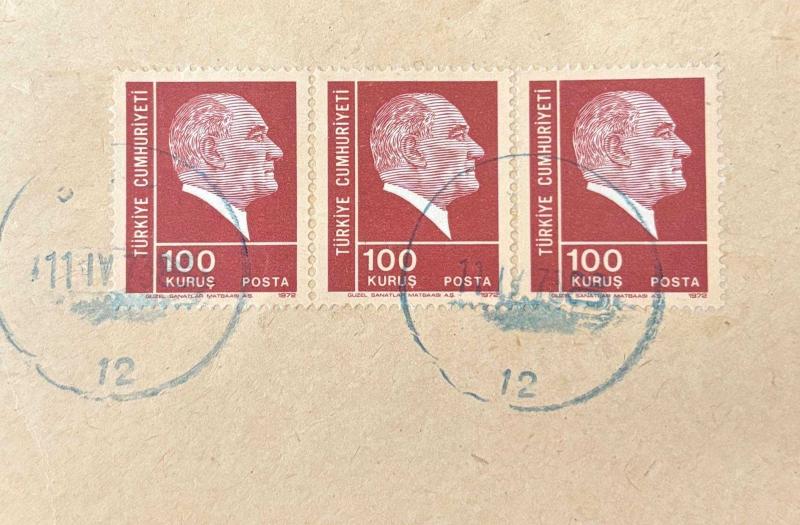 Mektup Zarfından Kesilmiş / Postadan Geçmiş Üçlü Pul Filateli - 11 Nisan 1973 Damgalı - ATATÜRK, 100 KURUŞ - Türkiye Cumhuriyeti, 1 yıl önce satışa sunulmuştur.