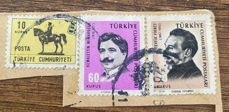 Mektup Zarfından Kesilmiş / Postadan Geçmiş Üçlü Pul Filateli - Damgalı - ATLI ATATÜRK, 10 KURUŞ / KEMALETTİN MİMAROĞLU, 60 KURUŞ / TEVFİK FİKRET, 10 KURUŞ - Türkiye Cumhuriyeti, en son 1 yıl önce güncellenmiştir.