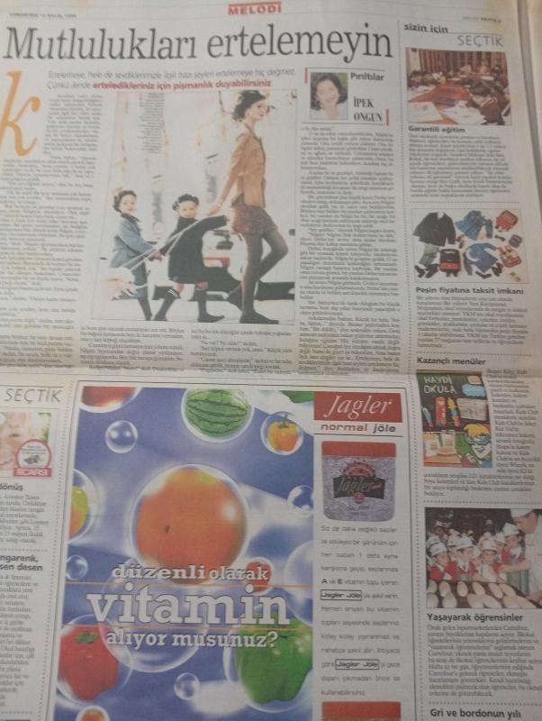 Melodi Doğum günü Gazetesi-12 eylül 1998- Müşteri her zaman haklı mı-müşteri daima haklıdır-mimoza dergisi-Hülya Avşar-Ayşe Özgün-müşteri edebiyatı abartılıyor-Emsan-vestel-ağzınızı açarken dikkat-Şirin Sever-ağız kokusu-colgate-Bellona yatak--mutluluklari-İzmir fuarı’nın eski tadı yok-jagler-Mavi Jeans-beyaz eşya-şerif ercan-hunca-pınar aylin-yataş yatak-Gaysan mobilya-Beymen-minyon grup-sayfa sayısı altı adlı eser Türkçe dilindedir.