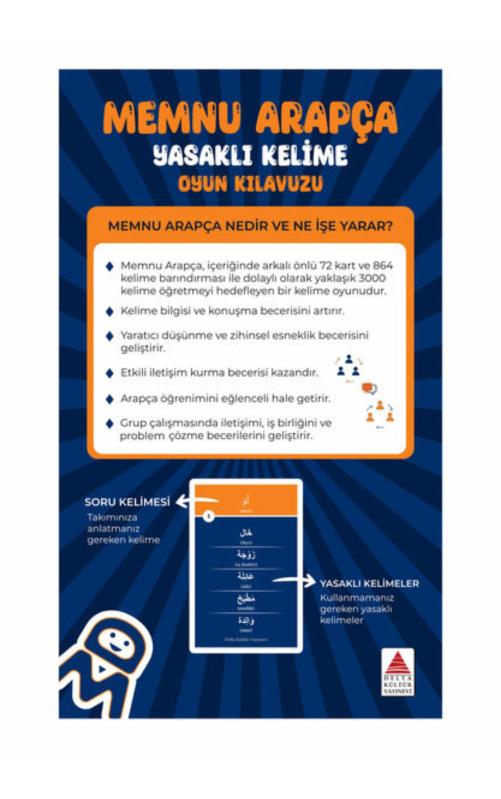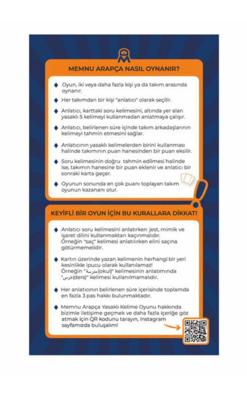 Memnu Arapça Kutu Oyunu (3000 Arapça Kelime Öğreten Oyun) Arapça Kelime Öğreten Tabu Oyunu Memnu Arapça Kutu Oyunu – 3000 Kelimeyle Arapça Öğrenmenin En Eğlenceli Hali! Memnu Arapça Kutu Oyunu, klasik ezber yöntemlerini rafa kaldıran, oyunla öğrenmeyi esas alan yepyeni bir Arapça eğitim deneyimi sunar! İçeriğinde yer alan 3000 temel ve günlük Arapça kelimeyle, hem çocuklar hem de yetişkinler Arapçayı kolay, kalıcı ve eğlenceli bir şekilde öğreniyor. Oyunun Kazandırdıkları: 3000 kelimeyle Arapçada güçlü bir temel Eğlenirken fark etmeden öğrenme Hafıza geliştirici oyunlar sayesinde uzun süreli öğrenme Grup içinde oynanabilen eğitsel rekabet ortamı Kutu İçeriği: 3000 kelimeyi kapsayan Arapça-Türkçe kartlar Anlam eşleştirme kartları Oyun talimatları ve puanlama sistemi Yarışma, tahmin, eşleştirme gibi 10 farklı oyun kurgusu Kimler İçin Uygun? Arapçayı yeni öğrenen öğrenciler Kur’an kursları ve İmam Hatipler Dil eğitmenleri ve öğretmenler Ailece eğlenerek öğrenmek isteyen herkes Memnu Arapça ile ezber değil, eğlence var! Her kelime bir oyun, her oyun bir öğrenme fırsatı! Şimdi sipariş verin, siz de Arapçayı hem oynayarak hem öğrenerek keşfedin! Memnu Arapça nedir ve ne işe yarar? Memnu Arapça, içeriğinde arkalı önlü 72 kart ve 864 kelime barındırması ile dolaylı olarak yaklaşık 3000 kelime öğretmeyi hedefleyen bir kelime oyunudur. Kelime bilgisi ve konuşma becerisini artırır. Yaratıcı düşünme ve zihinsel esneklik becerisini geliştirir. Etkili iletişim kurma becerisi kazandır. Arapça öğrenimini eğlenceli hale getirir. Grup çalışmasında iletişimi, iş birliğini ve problem çözme becerilerini geliştirir. Nasıl oynanır? Oyun, iki veya daha fazla kişi ya da takım arasında oynanır. Her takımdan bir kişi "anlatıcı" olarak seçilir. Anlatıcı, karttaki soru kelimesini, altında yer alan yasaklı 5 kelimeyi kullanmadan anlatmaya çalışır. Anlatıcı, belirlenen süre içinde takım arkadaşlarının kelimeyi tahmin etmesini sağlar. Anlatıcının yasaklı kelimelerden birini kullanması halinde takımının puan hanesinden bir puan eksilir. Soru kelimesinin doğru tahmin edilmesi halinde ise, takımın hanesine bir puan eklenir ve anlatıcı bir sonraki karta geçer. Oyunun sonunda en çok puanı toplayan takım oyunun kazananı olur. Her anlatıcının belirlenen süre içerisinde toplamda en fazla 3 pas hakkı bulunmaktadır.