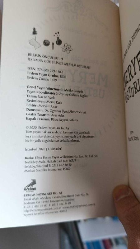 Meryem Usturlabi : İlk Kadın Gök Bilimci, Naz N. Varlı tarafından kaleme alınmıştır. Kitap 2020 yılında ERDEM ÇOCUK YAYINLARI tarafından [İstanbul] 9786052791301 ISBN kodu ile yayınlanmıştır. 112 sayfadır. Meryem Usturlabi : İlk Kadın Gök Bilimci adlı eser Türkçe dilindedir.