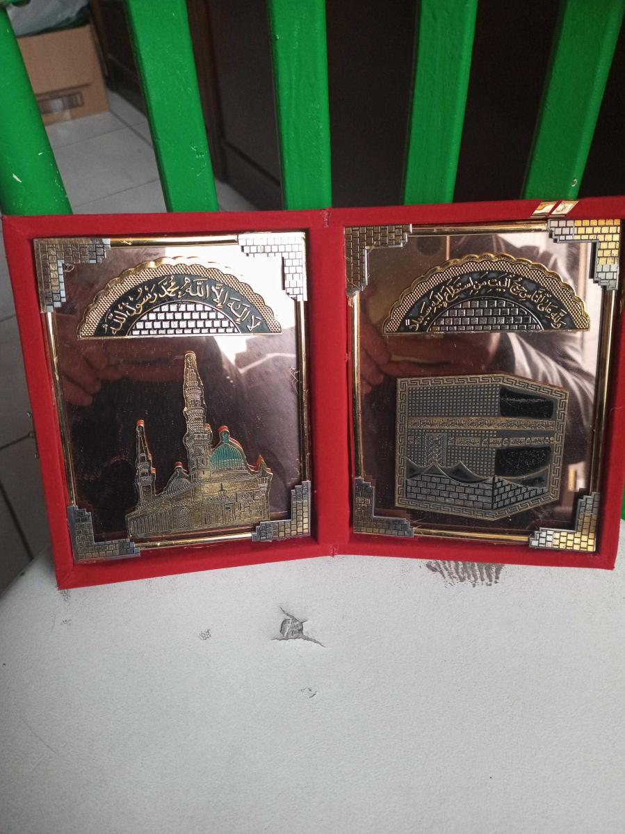 Mescid-i Nebevi ve Kabe tasvirlerini içeren, genellikle Hac veya Umre dönüşlerinde hediye edilen dekoratif bir dini kadife kutusunda Aynalı biblo, en son 19 saat önce güncellenmiştir.