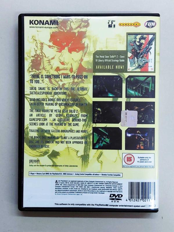 2001 yılında Konami tarafından piyasaya sürülen, orijinal PS2 Sony lisans damgalı Metal Gear Solid 2 Sons of Liberty oyunu. Oyun, standart sürüm değildir. 2 diskli özel versiyondur. İlk disk ana oyunu içerir.İkinci disk yapım aşamaları, yapımcı notları, sanat galerisi ve daha bir çok ek seçenek içermektedir. Lütfen standart Sons of Liberty versiyonları ile karıştırmayınız. Disklerde oynatmaya engel olmayan çizikler mevcuttur. İki diskte denenmiştir, sorunsuz bir şekilde çalışmaktadır. Son fotoğraflarda çalışır halde görüntüleri mevcuttur. Kutulu PS2 oyunu biriktirenler ve MGS hayranları için arşivlik bir üründür.