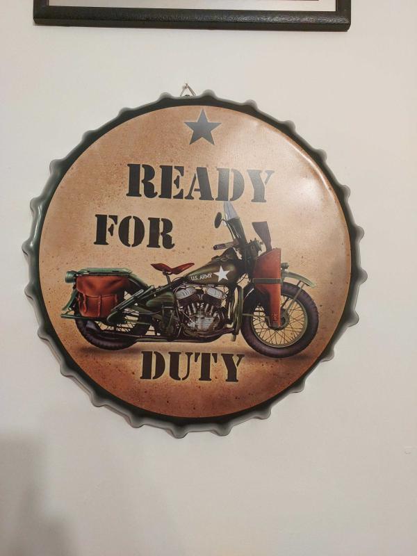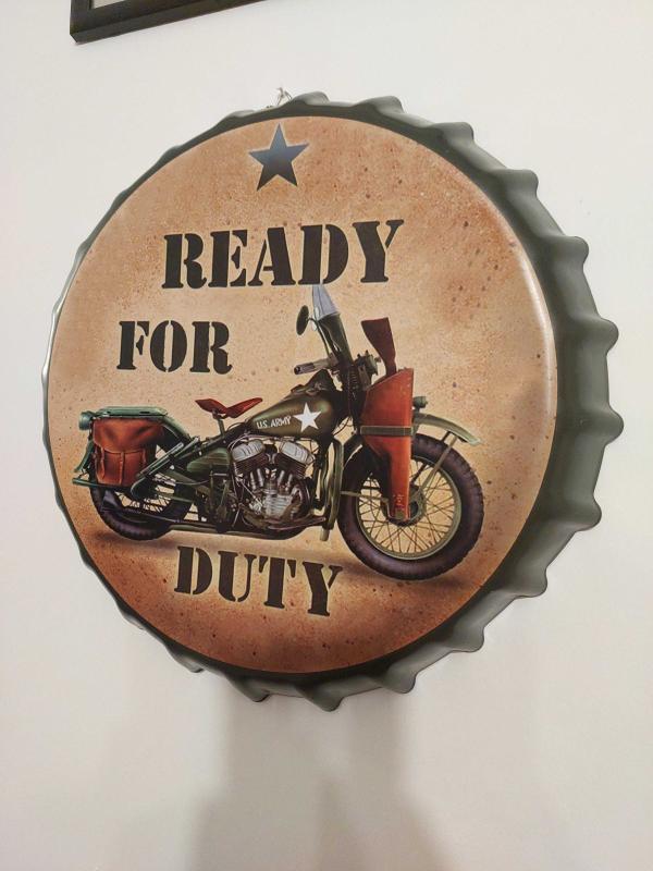 Metal Kapak Şeklinde Duvar Dekorasyonu Tablodur.Ready For Duty Retro Kaliteli Bir görsele sahiptir.Asla gün ışığından mevsim koşullarından etkilenmez.Evinizde,Hobi odalarınızda,Ofis ve bir çok farklı ortamda kullanıldığında ayrı bir ambians içerir.Tam 35 Cm Çapındadır.Herhangi bir kusuru bulunmamaktadır.İsterseniz duvara asarak ya da istediğiniz bir noktaya konumlandırarrakta kullanabilirsiniz.Herhangi bir deformesi yoktur.Özenle paketlenecektir.Diğer İlânlarımı incelemeyi unutmayınız.