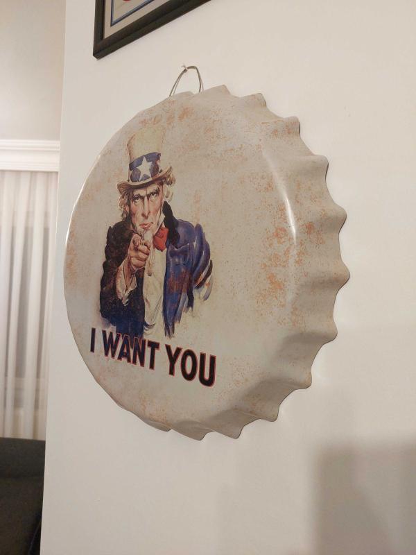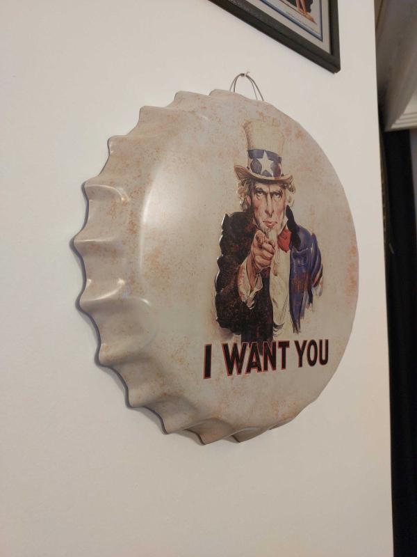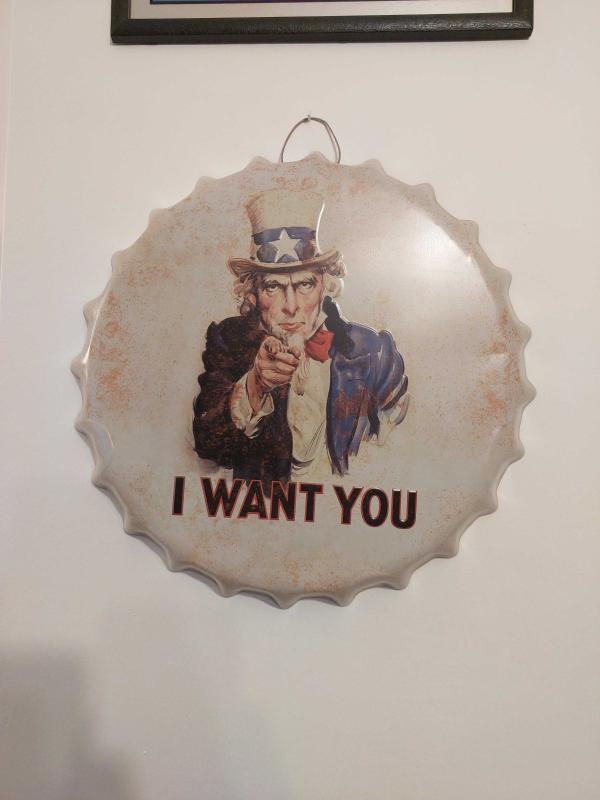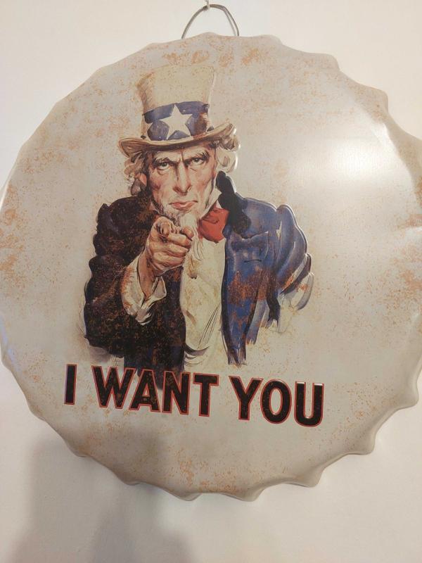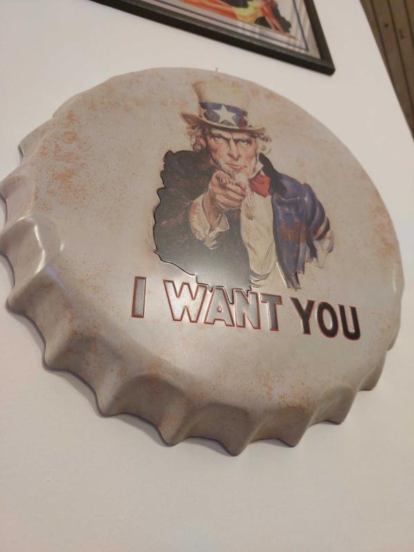 Metal Kapak Şeklinde Duvar Dekorasyonu Tablodur.I WANT YOU Retro Kaliteli Bir görsele sahiptir.Asla gün ışığından mevsim koşullarından etkilenmez.Evinizde,Hobi odalarınızda,Ofis ve bir çok farklı ortamda kullanıldığında ayrı bir ambians içerir.Tam 35 Cm Çapındadır.Herhangi bir kusuru bulunmamaktadır.İsterseniz duvara asarak ya da istediğiniz bir noktaya konumlandırarrakta kullanabilirsiniz.Herhangi bir deformesi yoktur.Özenle paketlenecektir.Diğer İlânlarımı incelemeyi unutmayınız.