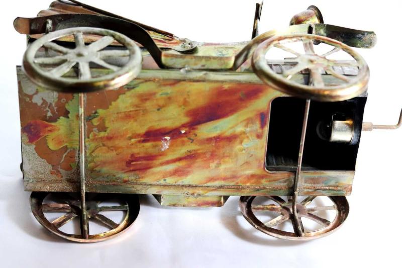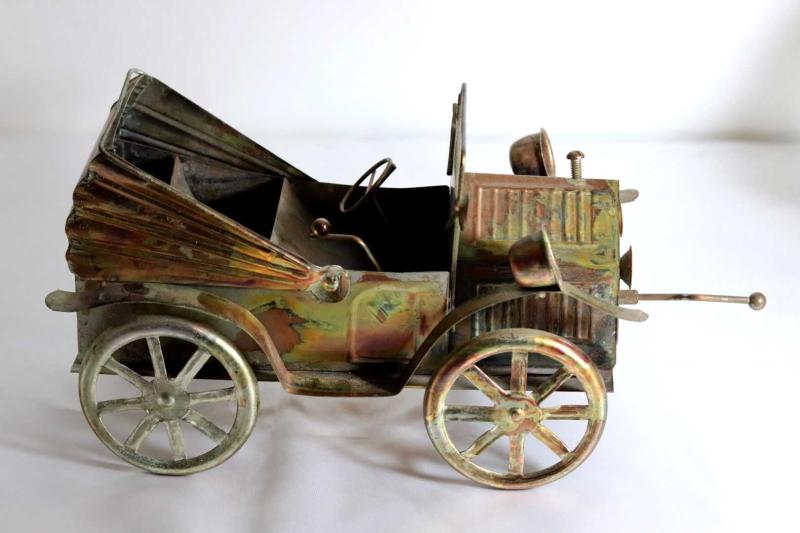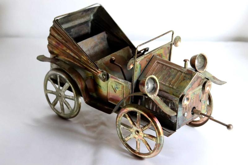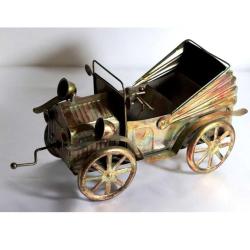 Metal, el yapımı önden çevirme kollu, müzik kutulu klasik araba. Boy 28cm. Y 15cm. başlıklı antika/koleksiyon objesinin menşei belirtilmemiştir. 1950-1999 arası dönemine aittir.
