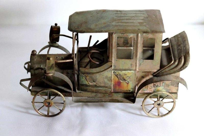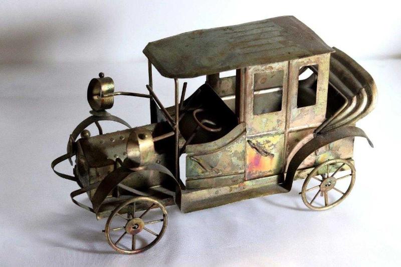 Metal, el yapımı önden çevirme kollu, müzik kutusu klasik araba. Boy 28cm. Y 15cm. başlıklı antika/koleksiyon objesinin menşei belirtilmemiştir. Objenin ait olduğu dönem bilinmeketedir.