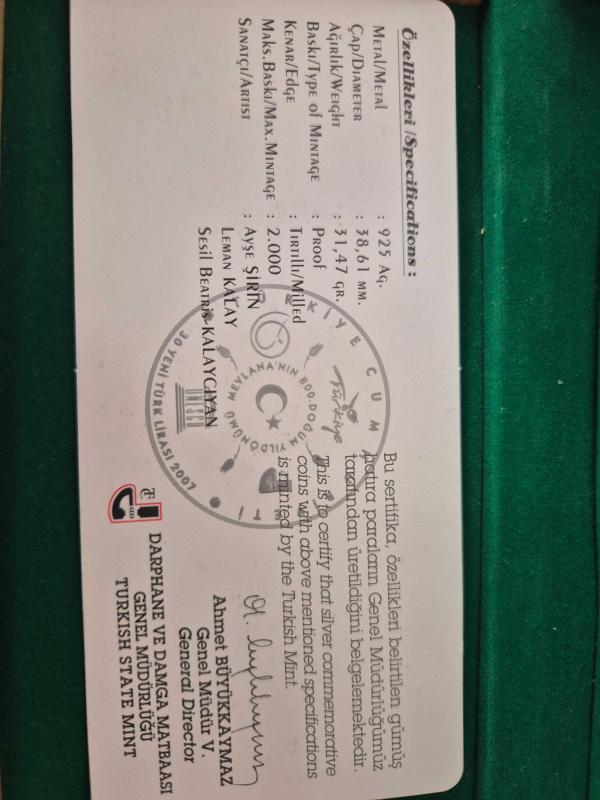 2007 yılında Mevlana 800. Dogum Yılı anısına Darphane tarafından basılan hatira para setidir. Yalnızca 2000 adet üretilmiştir. Orijinal kutusunda ve sertifikası ile ilk günkü gibi muhafaza edilmiş nadir bir koleksiyon ürünüdür.