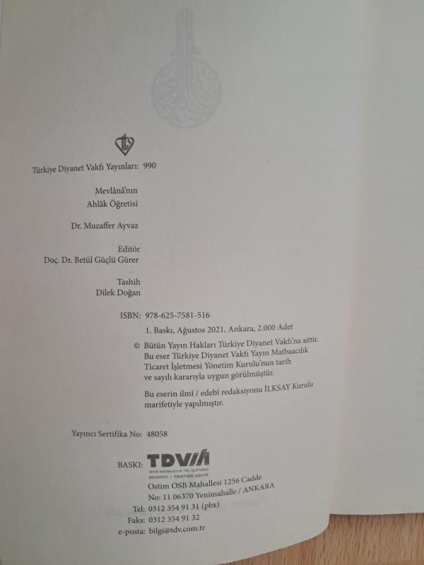 Mevlana'nın Ahlak Öğretisi, Muzaffer Ayvaz tarafından kaleme alınmıştır. Kitap 2021 yılında Diyanet vakfı tarafından [ANKARA] yayınlanmıştır. Satışta olan kitap, yayınevinin 1. baskısıdır. Mevlana'nın Ahlak Öğretisi adlı eser Türkçe dilindedir.