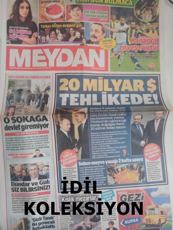 Meydan Haftalık Aktüalite, Sinema ve Magazin Gazetesi - 1 Aralık 2015 - 20 Milyar $ Tehlikede! - Recep Tayyip Erdoğan - Vladimir Putin - O Sokağa devlet giremiyor - Can Dünar ve Erdem Gül: Siz Bilirsiniz! - İbrahim Aydın - Hamza Celepoğlu - Meral Akşener - Efsane Boksörle Ringe Çıkacak - Sarp Levendoğlu - Danny Williams - Erhan Yazıcıoğlu - Keremcem - Ezgi Asaroğlu - Erkek Çocuk Gibiydim - Bestemsu Özdemir - Aslıhan Erkişi - Asker arkadaşım Tahir Ağabey - Anneni hiç üzme oğlum - Şahan Gökbakar - Kimse Kızmasın - Sema Denker - Türkan Şoray - Yağmur Ünal - Üç kafadar alışverişte - Zafer Algöz - Ozan Güven - Kadir İnanır - Ayşen Gruda - Hayko Cepkin - Çocuğunuzun öksürüğü alerjik olabilir - 20 yaş dişleri çekilmeli mi? - Diş teli çocuğun konuşmasını bozar mı - Hiç mi zararı yok - Dünyada yeni trend: Acı Sos - Hacer Özkaya fotoğraf ve haberi - Gazete Tam Değildir Sadece 4 Sayfası Mevcuttur Yıpranma, sararmalar, kupon kesiği ve yırtılmalar zamana bağlı olarak görülebilir