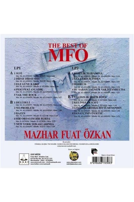 Mfö; The best of mfö (yeni baskı 2'li plak) Lp 1 / a yüzü: Sufi Söz: Mazhar alanson müzik: M; F; Ö Diday diday day Söz: Mazhar alanson müzik: M; F; Ö Ele güne karşı Söz: Mazhar alanson müzik: Fuat güner Peki peki anladık Söz; Müzik: Mazhar alanson Vak the rock Söz; Müzik: Mazhar alanson Lp 1 / b yüzü: Deli deli Söz; Müzik: Mazhar alanson No problem Söz: Mazhar alanson müzik: M; F; Ö Bazen Söz: Mazhar alanson müzik: Özkan uğur Bir ordayım bir buradayım Söz; Müzik: Fuat güner New york sokaklarında Söz: Mazhar alanson müzik: M; F; Ö Lp 2 / a yüzü: Buselik makamında Söz; Müzik: Mazhar alanson Güllerin içinden Söz; Müzik: Mazhar alanson Bodrum Söz; Müzik: Mazhar alanson Bu sabah yağmur var istanbul’da Söz; Müzik: Mazhar alanson Lp 1 / b yüzü: Yalnızlık ömür boyu Söz: Mazhar alanson müzik: Fuat güner Kelimeler kafi Söz: Mazhar alanson müzik: Fuat güner Gözyaşlarımızı bitti mi sandın Söz; Müzik: Mazhar alanson Sanatçının öyküsü Söz; Müzik: Mazhar alanson; Marka: İz Yayıncılık Model Kodu: 00344 Barkod: TYBS633LB4CX5DZW41