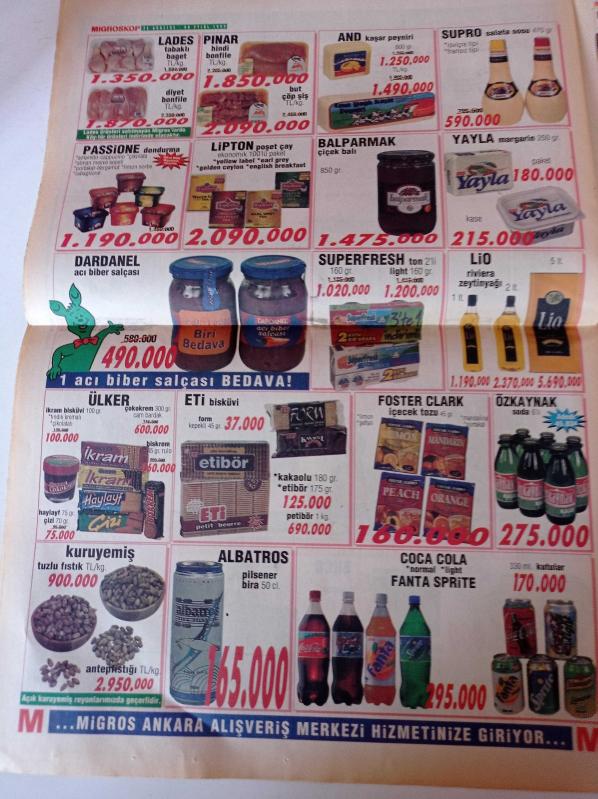 Migroskop Gazetesi - 26 Ağustos 8 Eylül 1999 - Sayı 225 - Migros Alışveriş Merkezî - Türk Hava Yolları - Burger King - Tefal- Köytür Piliç - Coca Cola - Fanta - Fiyat İndeksi adlı eser Türkçe dilindedir.