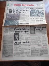Milli Gazete - 2 Kasım 1987 - Recep Tayyip Erdoğan - TİM SE Dar ve Orta Gelirli Ev Sahibi Olamaz- Abdurrahman Dilipak - Emine Şenlikoğlu - Osmanlıca Arapça Kadar Önemlidir - Behice Boran Ve Başörtülü Vatandaş - Bülent Ecevit Her Şey İşçi Aleyhine - Necmettin Erbakan Turgut Özal'ı TV'de Tartışmaya Çağırdı - Refah Partisi'nden Ödleri Kopuyor - Başbakan Turgut Özal Komünistlerle Dinciler Aynı - Esad Coşan Tercümanı Yalanladı - Recai Kutan - Lütfi Doğan - Ziyad Ebuzziya Harf Devrimi Hata İdi adlı eser, Kitap > Süreli Yayınlar > Gazeteler kategorisinde İkinci El olarak satıştadır.