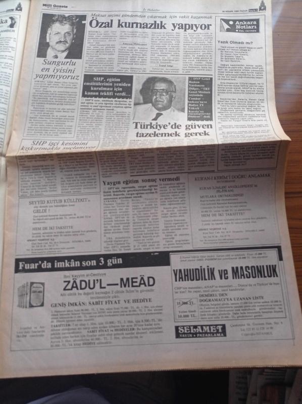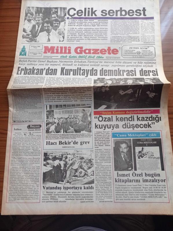 Milli Gazete - 30 Nisan 1989 - Şanlıurfa Belediye Başkanı İbrahim Halil Çelik Serbest - Refah Partisi - Necmettin Erbakan'dan Kurultayda Demokrasi Dersi - Hak İş Sendikası - Öz Gıda İş Sendikası - Şekerci Hacı Bekir'de Grev - İsmet Özel Bugün Kitaplarını İmzalıyor - Hasan Aksay - Turgut Özal Kendi Kazdığı Kuyuya Düşecek - Seçim Kanunu Değiştirilmelidir adlı eser Türkçe dilindedir.