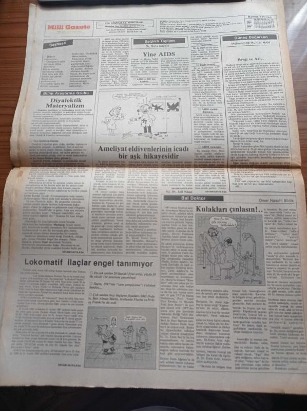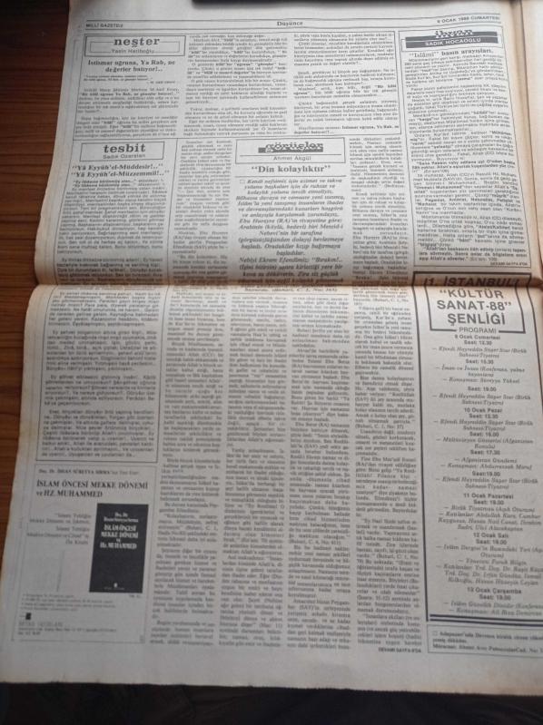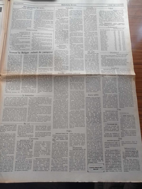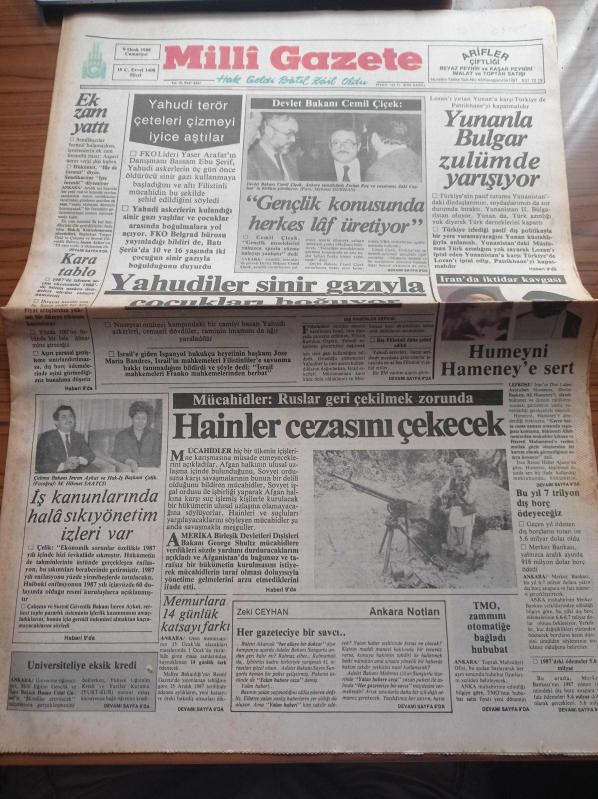 Milli Gazete - 9 Ocak 1988 - Diyalektik Materyalizm - Yahudi Terör Çeteleri Çizmeyi İyice Aştılar - Çalışma Bakanı İmren Aykut - Yunanla Bulgar Zulümde Yarışıyor - Mücahidler Ruslar Geri Çekilmek Zorunda - Humeyni Hamaney'e Sert - Devlet Bakanı Cemil Çiçek Gençlik Konusunda Herkes Laf Üretiyor - Yahudiler Sinir Gazıyla Çocukları Boğuyor adlı eser Türkçe dilindedir.