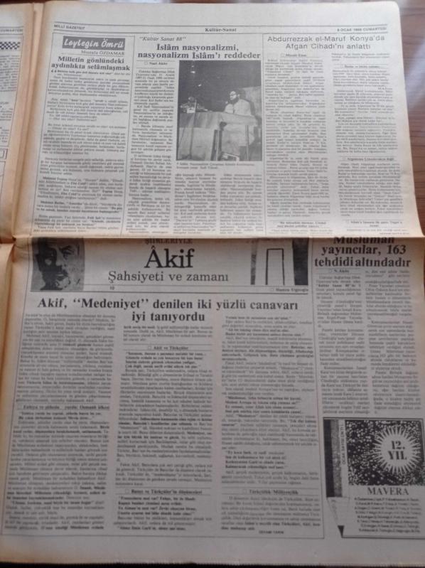 Milli Gazete - 9 Ocak 1988 - Müslüman Yayıncılar 163 Tehdidi Altında - Kadınlar Hayatın Neresinde Yazı Dizisi - Agaçsız Binaya Ruhsat Yok - Diyalektik Materyalizm - Yahudi Terör Çeteleri Çizmeyi İyice Aştılar - Çalışma Bakanı İmren Aykut - Yunanla Bulgar Zulümde Yarışıyor - Mücahidler Ruslar Geri Çekilmek Zorunda - Humeyni Hamaney'e Sert - Devlet Bakanı Cemil Çiçek Gençlik Konusunda Herkes Laf Üretiyor - Yahudiler Sinir Gazıyla Çocukları Boğuyor adlı eser Türkçe dilindedir.