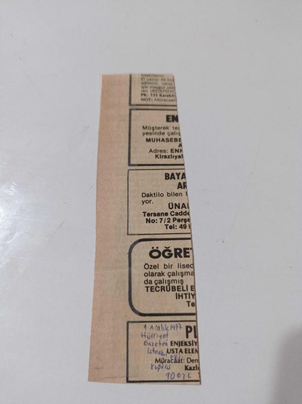 Fotoğraf Boyutu:4*14cm Sayfa Sayısı: 2 Hürriyet Gazetesi İstanbul Eki Kupürü 1 Aralık 1977 Yıpranma, sararmalar, kupon kesiği ve yırtılmalar zamana bağlı olarak görülebilir