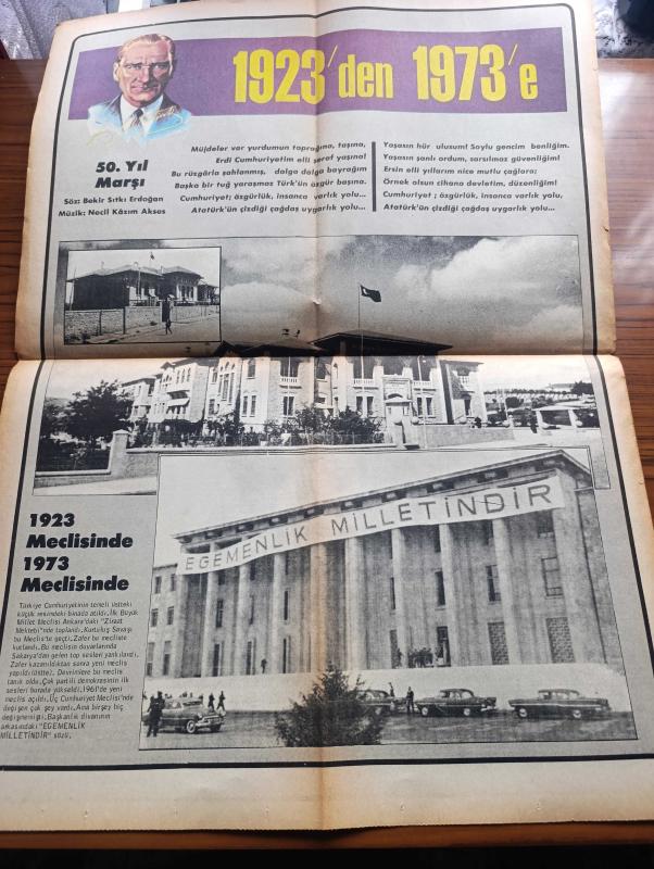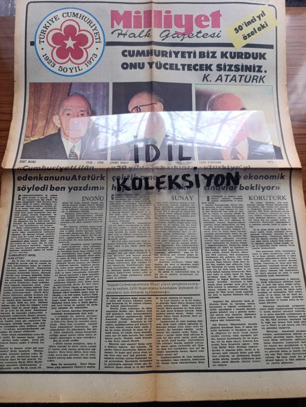 Milliyet 50. Yıl Gazetesi - Turkish Newspaper - 29 Ekim 1973 - İsmet İnönü Cumhuriyeti ilan eden kanunu Atatürk söyledi Ben yazdım Fotoğrafı - Cevdet Sunay 50 yılda çok sıkıntı çektik ama hepsini de yendik Fotoğrafı - Fahri Korutürk Türkiye'yi sosyal ve ekonomik sınavlar bekliyor Fotoğrafı - Cumhuriyeti nasıl ilan ettik - Celal Bayar rahatsız bulunduğunu söyleyerek düşüncelerini özür dileyerek açıklamamıştır - Elli Yılda Türk halkı üç kat büyüdü - nüfusun dağılış oranı - erkeklerin %70'i kadınların ise %50'si okur yazar - okuma yazma oranı tablosu - Cumhuriyet Türk tarihinde en köklü eğitim reformlarının yapıldığı dönemdir - nüfusun gelişimi tablo - 50. Yıl marşı söz Bekir Sıtkı Erdoğan müzik Necil Kazım Akses - 1923 meclisinde 1973 meclisinde fotoğraflar - enflasyon ve devalüasyon - para ve bankacılık - elektrik üretimi yılda %12 artıyor ve yetmiyor - 1970'lerde sanayi ilk olarak tarımı geride bıraktı - Her bin kişiye 4 araba ve 16 telefon düşüyor - tarım yerine sanayi adlı eser, Kitap > Süreli Yayınlar > Gazeteler > Türkiye > Genel > Günlük kategorisinde İkinci El olarak satıştadır.