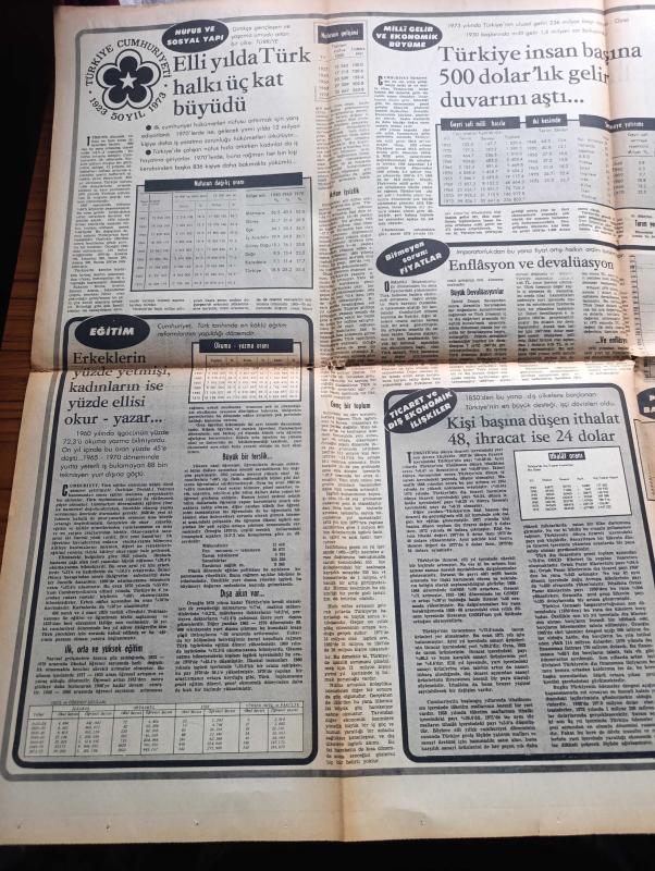 Milliyet 50. Yıl Gazetesi - Turkish Newspaper - 29 Ekim 1973 - İsmet İnönü Cumhuriyeti ilan eden kanunu Atatürk söyledi Ben yazdım Fotoğrafı - Cevdet Sunay 50 yılda çok sıkıntı çektik ama hepsini de yendik Fotoğrafı - Fahri Korutürk Türkiye'yi sosyal ve ekonomik sınavlar bekliyor Fotoğrafı - Cumhuriyeti nasıl ilan ettik - Celal Bayar rahatsız bulunduğunu söyleyerek düşüncelerini özür dileyerek açıklamamıştır - Elli Yılda Türk halkı üç kat büyüdü - nüfusun dağılış oranı - erkeklerin %70'i kadınların ise %50'si okur yazar - okuma yazma oranı tablosu - Cumhuriyet Türk tarihinde en köklü eğitim reformlarının yapıldığı dönemdir - nüfusun gelişimi tablo - 50. Yıl marşı söz Bekir Sıtkı Erdoğan müzik Necil Kazım Akses - 1923 meclisinde 1973 meclisinde fotoğraflar - enflasyon ve devalüasyon - para ve bankacılık - elektrik üretimi yılda %12 artıyor ve yetmiyor - 1970'lerde sanayi ilk olarak tarımı geride bıraktı - Her bin kişiye 4 araba ve 16 telefon düşüyor - tarım yerine sanayi, Ali Naci Karacan tarafından kaleme alınmıştır. Milliyet 50. Yıl Gazetesi - Turkish Newspaper - 29 Ekim 1973 - İsmet İnönü Cumhuriyeti ilan eden kanunu Atatürk söyledi Ben yazdım Fotoğrafı - Cevdet Sunay 50 yılda çok sıkıntı çektik ama hepsini de yendik Fotoğrafı - Fahri Korutürk Türkiye'yi sosyal ve ekonomik sınavlar bekliyor Fotoğrafı - Cumhuriyeti nasıl ilan ettik - Celal Bayar rahatsız bulunduğunu söyleyerek düşüncelerini özür dileyerek açıklamamıştır - Elli Yılda Türk halkı üç kat büyüdü - nüfusun dağılış oranı - erkeklerin %70'i kadınların ise %50'si okur yazar - okuma yazma oranı tablosu - Cumhuriyet Türk tarihinde en köklü eğitim reformlarının yapıldığı dönemdir - nüfusun gelişimi tablo - 50. Yıl marşı söz Bekir Sıtkı Erdoğan müzik Necil Kazım Akses - 1923 meclisinde 1973 meclisinde fotoğraflar - enflasyon ve devalüasyon - para ve bankacılık - elektrik üretimi yılda %12 artıyor ve yetmiyor - 1970'lerde sanayi ilk olarak tarımı geride bıraktı - Her bin kişiye 4 araba ve 16 telefon düşüyor - tarım yerine sanayi adlı eser Türkçe dilindedir.