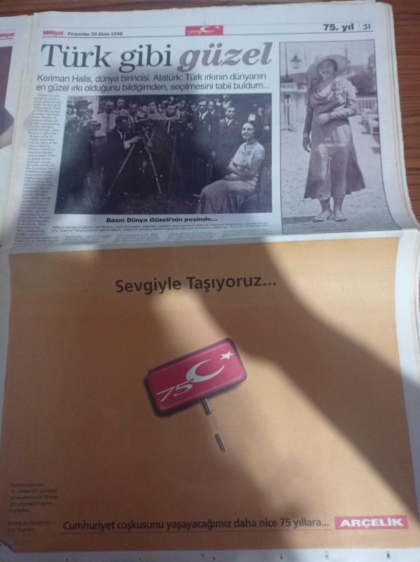 Milliyet 75. Yıl Gazetesi - 29 Ekim 1998 - Cici Kızlar Belleklerden Silinmedi - Eurovision -Ve Asya Avrupa Birleşti - Cumhuriyetin İlk Reklam Yıldızları - Öztürk Serengil - Turgay Şeren - Samanyolu 300 Binle Hit Oldu - Erkin Koray - Cem Karaca - Barış Manço - Louis Armstrong Türkiye'de - Radyolu Günler Tam Bir Şenlik - Cep Kitapları Meydan Muharebesi - Naylon İcadı - Şimdi Yerli Malı Zamanı - Nimet Abla İşe Tayyare Piyangosu İle Başladı - Türk Güzeli Keriman Halis - Ankara Palas - Gazi Mustafa Kemal Atatürk adlı eser Türkçe dilindedir.