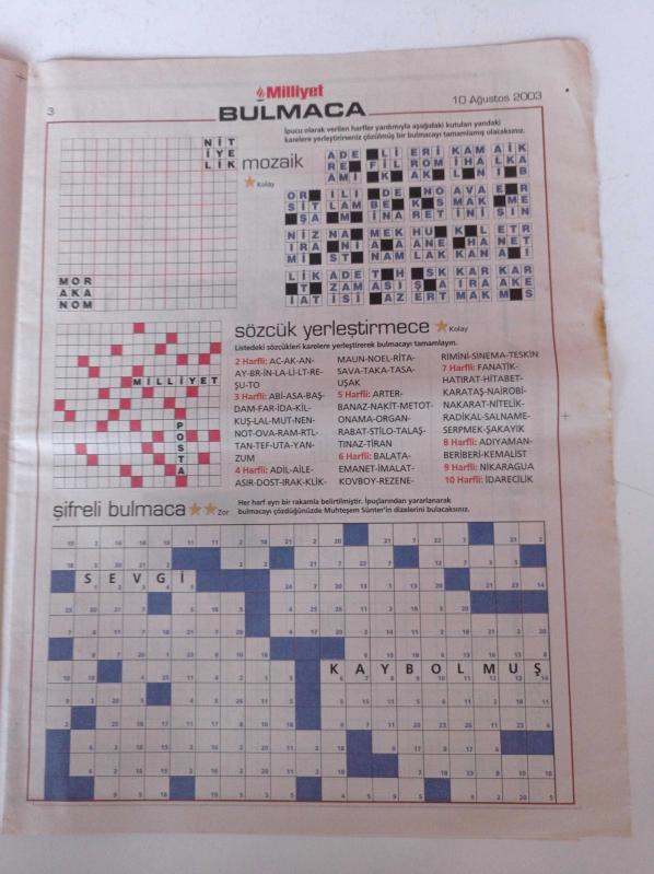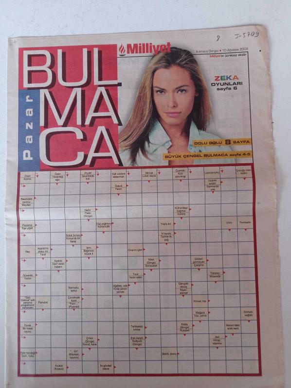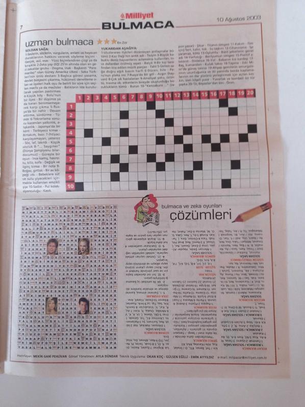 Milliyet Bulmaca Gazetesi - 10 Ağustos 2003 - Şifreli Bulmaca - Sözcük Yerleştirmece -Brad Pitt Fotoğrafı - Nicole Kidman - Kim Bassinger - Alec Baldwin- Petek Bulmaca - Zeka Oyunları - Mozaik Bulmaca adlı eser Türkçe dilindedir.