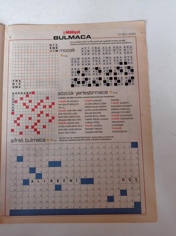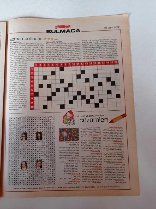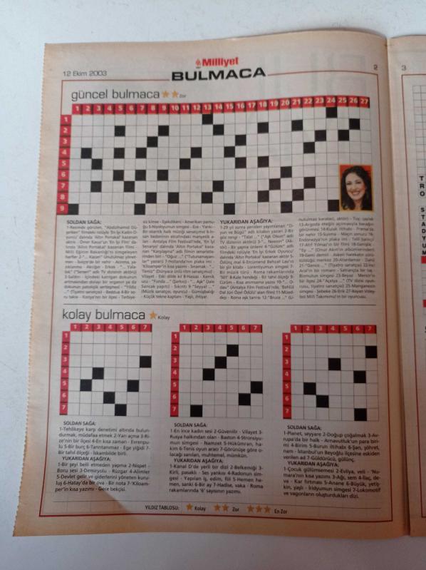 Milliyet Bulmaca Gazetesi - 12 Ekim 2003 - Tarık Akan Fotoğrafı - Meltem Cumbul - Zeki Müren - Barış Manço - Onno Tunç - Kemal Sunal - Sözcük Avı adlı eser Türkçe dilindedir.