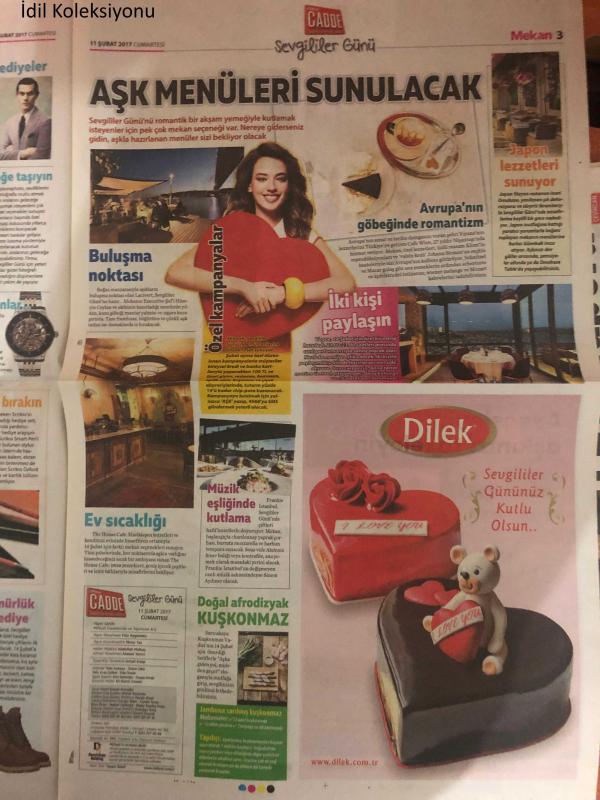 Milliyet Cadde Gazetesi , 11 Şubat 2017 , Sevgililer Günü , Aşk Olsun , Mutlu Anılar İçin , Aşk Menüleri Sunulacak , Japon Lezzetleri Sunuyor , Ev Sıcaklığı , Uygur Kardeşlerden Özel Armağanlar , Çiftler İçin Konaklama , Rüya Gibi Bir Gün , Ekmekten Hediye Olur Mu , Bir Otelden Daha Fazlası adlı eser Türkçe dilindedir.