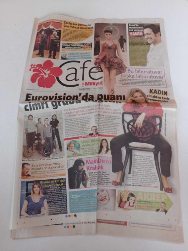 Milliyet Cafe Gazetesi - 17 Mart 2008 - Okan Bayülgen'in Makinası Disco Kralı Olacak - Eurovision'da Puanı Cimri Gruba Düştük - Sedef Kabaş - Sarp Apak'ın Reinada Mankenlerle Poz Vermesi Yasak - Tolga Çevik - Salih Kalyon - Mor Ve Ötesi adlı eser Türkçe dilindedir.