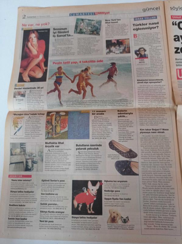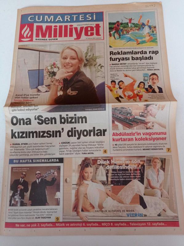 Milliyet Cumartesi Gazetesi - 27 Temmuz 2002 - Haber Spikeri Sonay Dikkaya Fotoğrafı - Siyah Giyen Adamlar Filmi - Will Smith - Dilek Hanif'in Son Defilesi - Ragga Oktay - Rap - Abdülaziz'in Vagonunu Kurtaran Koleksiyoner Mete Tekyıldız adlı eser Türkçe dilindedir.
