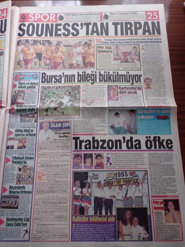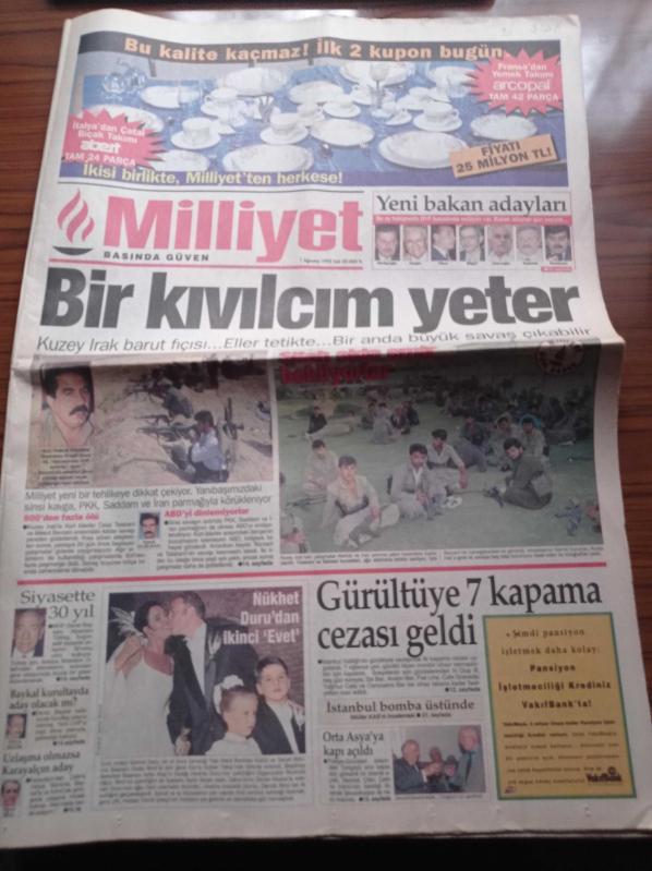 Milliyet Gazetesi - 1 Ağustos 1995 - Bursaspor'un Bileği Bükülmüyor - Gülay Atığ'ın Sporcu Ordusu - Bayanlar Futbolda Dinarsu Fırtınası - Kuzey Irak Barut Fıçısı - MHP Başkanını Alparslan Türkeş Siyasette 30. Yılını Kutluyor - Fatih Altaylı İle Ali Desidero'nun Koruma Polemiği - Nükhet Duru'dan İkinci Evet - Liderler Sahalarda - Tansu Çiller - Süleyman Demirel