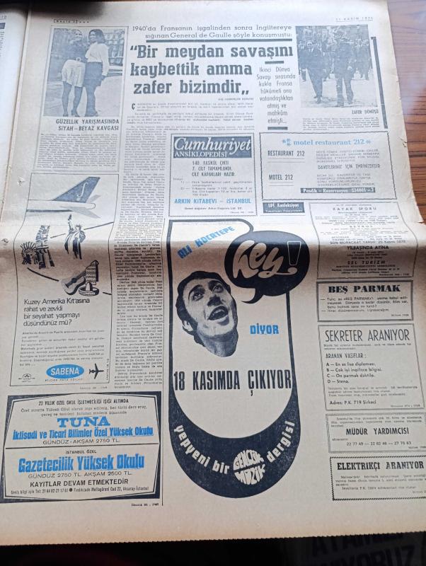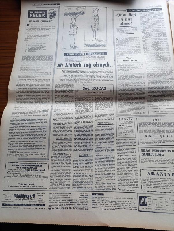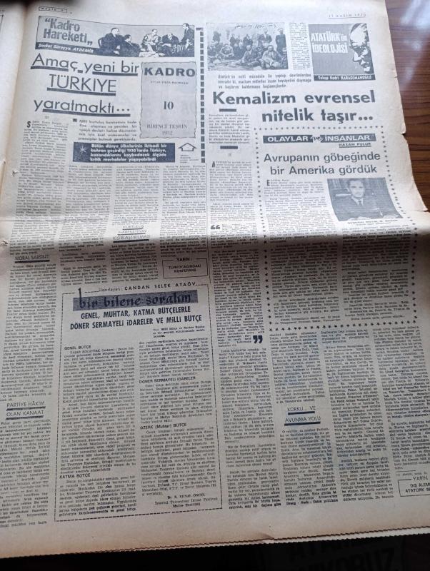 Milliyet Gazetesi - 11 Kasım 1970 - Eski Askerler Aslan Olmazlar Yazan Abdi İpekçi Köşe Yazısı - De Gaulle Öldü - Başbakan Süleyman Demirel Bugün De Gaulle İçin Hazırlanacak Tören İçin Paris'e Gidecek - Atatürk'ü Andık - İsmet İnönü Ankara TV'sindeki Konuşmasında Atatürk Devrimlerinin Laik Cumhuriyet İlkeleri Hücuma Uğrayacaktır Dedi - Sovyet Sınırını Geçtikleri İddiasıyla Gümrü'ye İndirilen Askeri Uçakta Bulunan Albay Cevat Denli 2 Amerikalı General Ve U 8 İade Edildi - Ah Atatürk Sağ Olsaydı Yazan Sadi Koçaş - Kadro Hareketi Yazan Şevket Süreyya Aydemir Yazı Dizisi - Evli Bir Kadının Günlüğünden Yazan Peride Celal Yazı Dizisi - Karaoğlan Yazan Ve Çizen Suat Yalaz - Murat Davman'ın Son Macerası İki Kere İki On İki Eder Yazan Ümit Deniz Yazı Dizisi - Hoş Nemo Çizen Allah Capp - Atatürk'ün İdeolojisi Yazan Yakup Kadri Karaosmanoğlu - Muhammed Ali Clay'in Yumrukları İle Sendeleyen Quarry - Avusturya Basınının Görüşü Cemal Kamacı İyi Rakiple Karşılaştırılmadı - Eczacıbaşı Voleybol, Ali Naci Karacan tarafından kaleme alınmıştır. Milliyet Gazetesi - 11 Kasım 1970 - Eski Askerler Aslan Olmazlar Yazan Abdi İpekçi Köşe Yazısı - De Gaulle Öldü - Başbakan Süleyman Demirel Bugün De Gaulle İçin Hazırlanacak Tören İçin Paris'e Gidecek - Atatürk'ü Andık - İsmet İnönü Ankara TV'sindeki Konuşmasında Atatürk Devrimlerinin Laik Cumhuriyet İlkeleri Hücuma Uğrayacaktır Dedi - Sovyet Sınırını Geçtikleri İddiasıyla Gümrü'ye İndirilen Askeri Uçakta Bulunan Albay Cevat Denli 2 Amerikalı General Ve U 8 İade Edildi - Ah Atatürk Sağ Olsaydı Yazan Sadi Koçaş - Kadro Hareketi Yazan Şevket Süreyya Aydemir Yazı Dizisi - Evli Bir Kadının Günlüğünden Yazan Peride Celal Yazı Dizisi - Karaoğlan Yazan Ve Çizen Suat Yalaz - Murat Davman'ın Son Macerası İki Kere İki On İki Eder Yazan Ümit Deniz Yazı Dizisi - Hoş Nemo Çizen Allah Capp - Atatürk'ün İdeolojisi Yazan Yakup Kadri Karaosmanoğlu - Muhammed Ali Clay'in Yumrukları İle Sendeleyen Quarry - Avusturya Basınının Görüşü Cemal Kamacı İyi Rakiple Karşılaştırılmadı - Eczacıbaşı Voleybol adlı eser Türkçe dilindedir.