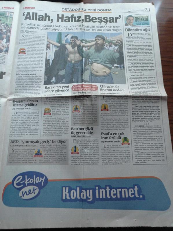 Milliyet Gazetesi - 13 Haziran 2000 - Suriye Devlet Başkanı Hafız Esad Bugün Toprağa Verilecek - Suriye'de Üç Gündür Allah Hafız Beşşar Sloganı Atılıyor - Ahmet Necdet Sezer Hafız Esad'ın Cenaze Törenine Katılacak - Suriye İle Savaşın Eşiğinden Barışa - Bergama Direnişçilerini Ağlatan Karar - Muammer Aksoy Ve Ahmet Taner Kışlalı Cinayetinin Kilit İsmi Ferhat Özmen Muammer Aksoy'u Susturuculu Silahla Vurdum adlı eser Türkçe dilindedir.