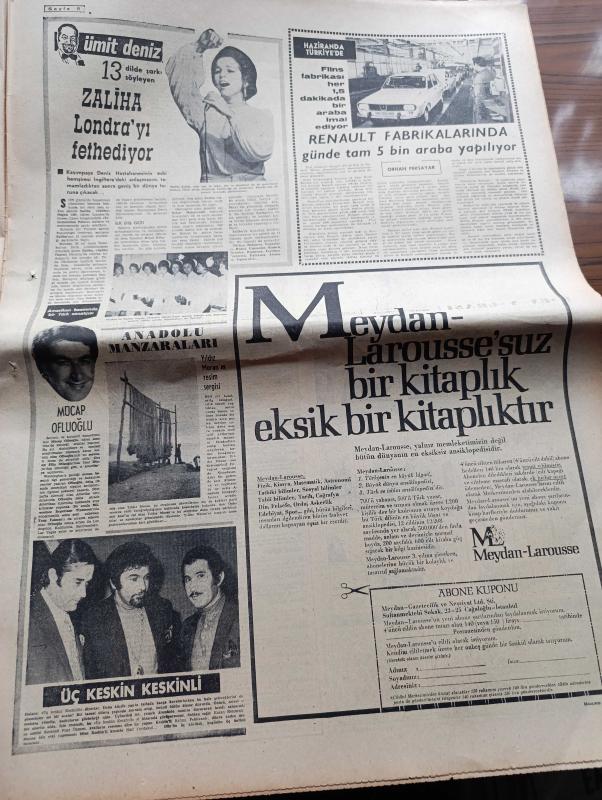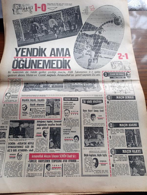 Milliyet Gazetesi - 14 Aralık 1970 - Çarşamba'nın Gelişi Yazan Abdi İpekçi Köşe Yazısı - Memurlara %30'lar Yarın Ödeniyor - Süleyman Demirel'e Daha Çok Yetkiler Verilmesi İstendi - İsmet İnönü Sanki Hükümet Yok Gibi - Sağlık Bakanı Hac Yasağı İçin Direniyor - Ülkü Ocakları Bütün Davalara Sahip Çıkacak - Kapıcılar Grevi Çalışma Bakanı Seyfi Öztürk'ün Evinden Alındı - Burhan Felek Köşe Yazısı - 13 Dilde Şarkı Söyleyen Zaliha Londra'yı Fethediyor - Renault Fabrikalarında Günde Tam 5 Bin Araba Yapılıyor - Evli Bir Kadının Günlüğünden Yazan Peride Celal Yazı Dizisi - Karaoğlan Yazan Ve Çizen Suat Yalaz - Murat Davman'ın Son Macerası İki Kere İki On İki Eder Yazan Ümit Deniz Yazı Dizisi - Hoş Memo Karikatür Çizen Al Capp - Johnny Hazard Çizen Frank Robbins - Sahne Aşkları Çizen Leonard Starr - Allahlık Ali Bey Çizen Swan - Kruşçev'in Anıları Yazı Dizisi - Jackie Onnasis Film Çevirecek - Milli Takım Arnavutluk'u Yendi Ama Öğünemedi, Ali Naci Karacan tarafından kaleme alınmıştır. Milliyet Gazetesi - 14 Aralık 1970 - Çarşamba'nın Gelişi Yazan Abdi İpekçi Köşe Yazısı - Memurlara %30'lar Yarın Ödeniyor - Süleyman Demirel'e Daha Çok Yetkiler Verilmesi İstendi - İsmet İnönü Sanki Hükümet Yok Gibi - Sağlık Bakanı Hac Yasağı İçin Direniyor - Ülkü Ocakları Bütün Davalara Sahip Çıkacak - Kapıcılar Grevi Çalışma Bakanı Seyfi Öztürk'ün Evinden Alındı - Burhan Felek Köşe Yazısı - 13 Dilde Şarkı Söyleyen Zaliha Londra'yı Fethediyor - Renault Fabrikalarında Günde Tam 5 Bin Araba Yapılıyor - Evli Bir Kadının Günlüğünden Yazan Peride Celal Yazı Dizisi - Karaoğlan Yazan Ve Çizen Suat Yalaz - Murat Davman'ın Son Macerası İki Kere İki On İki Eder Yazan Ümit Deniz Yazı Dizisi - Hoş Memo Karikatür Çizen Al Capp - Johnny Hazard Çizen Frank Robbins - Sahne Aşkları Çizen Leonard Starr - Allahlık Ali Bey Çizen Swan - Kruşçev'in Anıları Yazı Dizisi - Jackie Onnasis Film Çevirecek - Milli Takım Arnavutluk'u Yendi Ama Öğünemedi adlı eser Türkçe dilindedir.