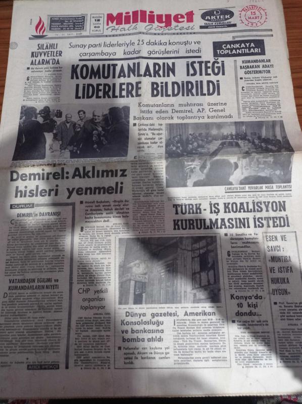 Milliyet Gazetesi - 15 Mart 1971 - Cumhurbaşkanı Cevdet Sunay Liderleriyle 25 Dakika Konuştu Ve Çarşambaya Kadar Görüşlerini İstedi - Silahlı Kuvvetler Alarmda - Komutanların Muhtırası Üzerine İstifa Eden Süleyman Demirel Adalet Partisi Genel Başkanı Olarak Toplantıya Katılmadı - Dünya Gazetesi Amerikan Konsolosluğu Ve Bankasına Bomba Atıldı - Genelkurmay Başkanı Orgeneral Memduh Tağmaç- Büyük Fırtına Yarın Akşam Kopacak Ya Cemal Kamacı Ya Da Roque Avrupa Şampiyonu Olacak - Galatasaray Beşiktaş'tan Zor Kurtuldu - Cihat Arman - Can Bartu - Şükrü Gülesin adlı eser Türkçe dilindedir.