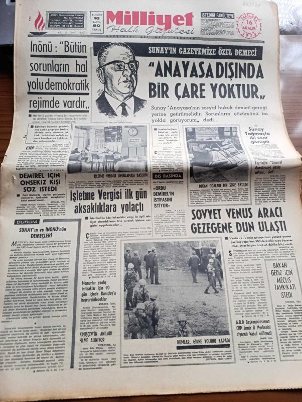 Milliyet Gazetesi - 16 Aralık 1970 - Sunay Ve İnönü'nün Demeçleri Yazan Abdi İpekçi Köşe Yazısı - İsmet İnönü Bütün Sorunların Hal Yolu Demokratik Rejimde Vardır - Süleyman Demirel İçin Onsekiz Kişi Söz İstedi - Cevdet Sunay'ın Gazetemizde Özel Demeci Anayasa Dışında Bir Çare Yoktur - Le Figaro Gazetesi Ordu Süleyman Demirel'in İstifasını İstiyor - Sovyet Venüs Aracı Gezegene Dün Ulaştı - Rumlar Girne Yolunu Kapadı - Olayların İzinde Yazan İsmail Cem - Franko Dün Olağan Üstü Hâl İlan Etti - Evli Bir Kadının Günlüğünden Yazan Peride Celal Yazı Dizisi - Hoş Memo Karikatür Çizen Al Capp - Johnny Hazard Çizen Frank Robbins - Sahne Aşkları Çizen Leonard Starr - Allahlık Ali Bey Çizen Swan - Maruf Bey Çizen Martin - Karaoğlan Yazan Ve Çizen Suat Yalaz - Murat Davman'ın Son Macerası İki Kere İki On İki Eder Yazan Ümit Deniz Yazı Dizisi - Kruşçev'in Anıları Yazı Dizisi - Milliyet Yılın Sporcusu Anketi - Jokey Ekrem Kurt - Boksör Seyfi Tatar - Futbolcu Can Bartu - Maratoncu Hüseyin Aktaş, Ali Naci Karacan tarafından kaleme alınmıştır. Milliyet Gazetesi - 16 Aralık 1970 - Sunay Ve İnönü'nün Demeçleri Yazan Abdi İpekçi Köşe Yazısı - İsmet İnönü Bütün Sorunların Hal Yolu Demokratik Rejimde Vardır - Süleyman Demirel İçin Onsekiz Kişi Söz İstedi - Cevdet Sunay'ın Gazetemizde Özel Demeci Anayasa Dışında Bir Çare Yoktur - Le Figaro Gazetesi Ordu Süleyman Demirel'in İstifasını İstiyor - Sovyet Venüs Aracı Gezegene Dün Ulaştı - Rumlar Girne Yolunu Kapadı - Olayların İzinde Yazan İsmail Cem - Franko Dün Olağan Üstü Hâl İlan Etti - Evli Bir Kadının Günlüğünden Yazan Peride Celal Yazı Dizisi - Hoş Memo Karikatür Çizen Al Capp - Johnny Hazard Çizen Frank Robbins - Sahne Aşkları Çizen Leonard Starr - Allahlık Ali Bey Çizen Swan - Maruf Bey Çizen Martin - Karaoğlan Yazan Ve Çizen Suat Yalaz - Murat Davman'ın Son Macerası İki Kere İki On İki Eder Yazan Ümit Deniz Yazı Dizisi - Kruşçev'in Anıları Yazı Dizisi - Milliyet Yılın Sporcusu Anketi - Jokey Ekrem Kurt - Boksör Seyfi Tatar - Futbolcu Can Bartu - Maratoncu Hüseyin Aktaş adlı eser Türkçe dilindedir.