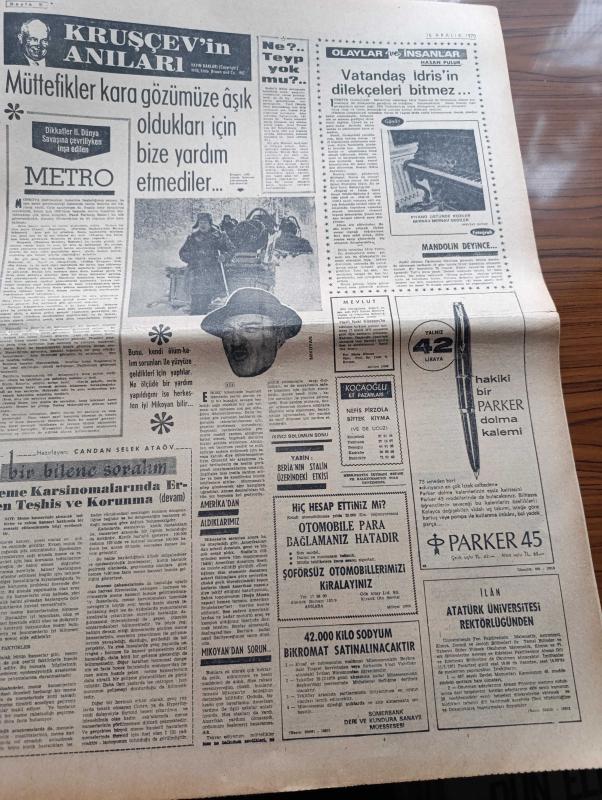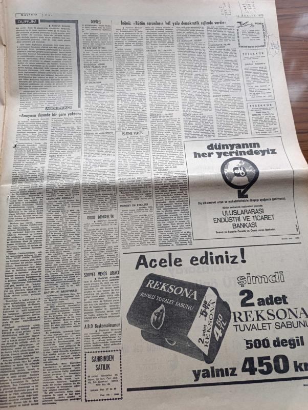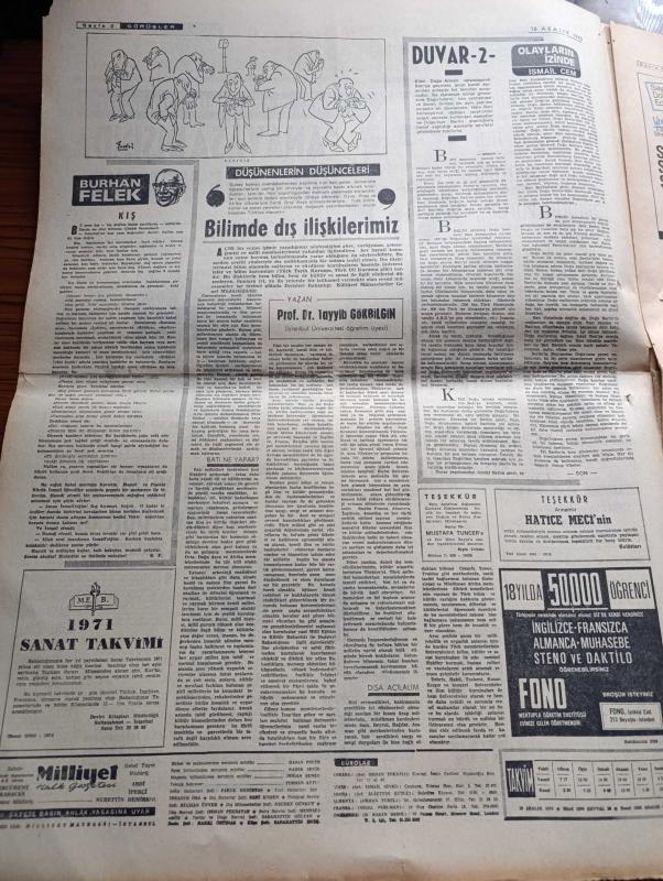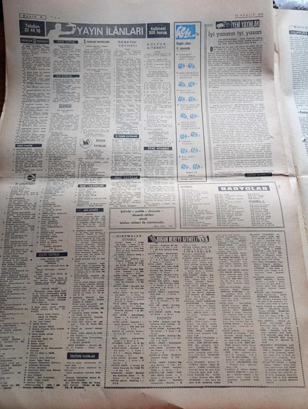 Milliyet Gazetesi - 16 Aralık 1970 - Sunay Ve İnönü'nün Demeçleri Yazan Abdi İpekçi Köşe Yazısı - İsmet İnönü Bütün Sorunların Hal Yolu Demokratik Rejimde Vardır - Süleyman Demirel İçin Onsekiz Kişi Söz İstedi - Cevdet Sunay'ın Gazetemizde Özel Demeci Anayasa Dışında Bir Çare Yoktur - Le Figaro Gazetesi Ordu Süleyman Demirel'in İstifasını İstiyor - Sovyet Venüs Aracı Gezegene Dün Ulaştı - Rumlar Girne Yolunu Kapadı - Olayların İzinde Yazan İsmail Cem - Franko Dün Olağan Üstü Hâl İlan Etti - Evli Bir Kadının Günlüğünden Yazan Peride Celal Yazı Dizisi - Hoş Memo Karikatür Çizen Al Capp - Johnny Hazard Çizen Frank Robbins - Sahne Aşkları Çizen Leonard Starr - Allahlık Ali Bey Çizen Swan - Maruf Bey Çizen Martin - Karaoğlan Yazan Ve Çizen Suat Yalaz - Murat Davman'ın Son Macerası İki Kere İki On İki Eder Yazan Ümit Deniz Yazı Dizisi - Kruşçev'in Anıları Yazı Dizisi - Milliyet Yılın Sporcusu Anketi - Jokey Ekrem Kurt - Boksör Seyfi Tatar - Futbolcu Can Bartu - Maratoncu Hüseyin Aktaş adlı eser, Kitap > Süreli Yayınlar > Gazeteler > Türkiye > Genel > Günlük kategorisinde İkinci El olarak satıştadır.