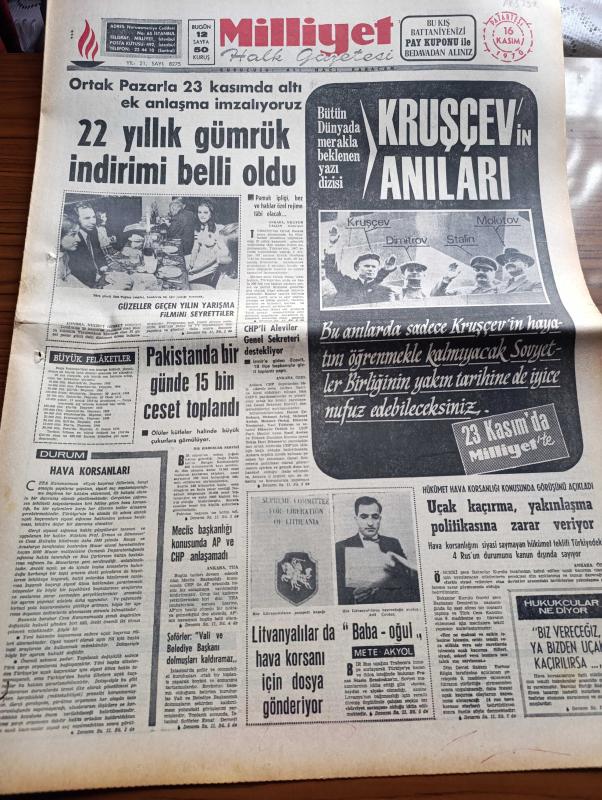 Milliyet Gazetesi - 16 Kasım 1970 - Ortak Pazarda 23 Kasım'da Altı Ek Anlaşma imzalıyoruz - 22 Yıllık Gümrük İndirimi Belli Oldu- Siklon Sebebiyle Pakistan'da Bir Günde 15 Bin Ceset Toplandı - CHP'li Aleviler Genel Sekreter Bülent Ecevit'i Destekliyor - Uçak Kaçırma Yakınlaşma Politikasına Zarar Veriyor - Hangisi Daha Güzel Dünya Güzellik Yarışması Adayları Fotoğraf - Abdi İpekçi Köşe Yazısı - Evli Bir Kadının Günlüğünden Yazan Peride Celal Yazı Dizisi - Karaoğlan Yazan Ve Çizen Suat Yalaz - Murat Davman'ın Son Macerası İki Kere İki On İki Eder Yazan Ümit Deniz - Hoş Memo Karikatür Çizen Al Capp - Johnny Hazard Çizen Frank Robbins - Sahne Aşkları Çizen Leonard Starr - Kadro Hareketi Yazan Şevket Süreyya Aydemir Yazı Dizisi - Galatasaray 4 Dakikada Yok Oldu - Beşiktaş Samsunspor Karşısında Son Beş Dakikada Devrildi - Fenerbahçe Göztepe Karşısında Galibiyeti Kaçırdı 0 0 - Şükrü Gülesin - Gündüz Kılıç, Ali Naci Karacan tarafından kaleme alınmıştır. Milliyet Gazetesi - 16 Kasım 1970 - Ortak Pazarda 23 Kasım'da Altı Ek Anlaşma imzalıyoruz - 22 Yıllık Gümrük İndirimi Belli Oldu- Siklon Sebebiyle Pakistan'da Bir Günde 15 Bin Ceset Toplandı - CHP'li Aleviler Genel Sekreter Bülent Ecevit'i Destekliyor - Uçak Kaçırma Yakınlaşma Politikasına Zarar Veriyor - Hangisi Daha Güzel Dünya Güzellik Yarışması Adayları Fotoğraf - Abdi İpekçi Köşe Yazısı - Evli Bir Kadının Günlüğünden Yazan Peride Celal Yazı Dizisi - Karaoğlan Yazan Ve Çizen Suat Yalaz - Murat Davman'ın Son Macerası İki Kere İki On İki Eder Yazan Ümit Deniz - Hoş Memo Karikatür Çizen Al Capp - Johnny Hazard Çizen Frank Robbins - Sahne Aşkları Çizen Leonard Starr - Kadro Hareketi Yazan Şevket Süreyya Aydemir Yazı Dizisi - Galatasaray 4 Dakikada Yok Oldu - Beşiktaş Samsunspor Karşısında Son Beş Dakikada Devrildi - Fenerbahçe Göztepe Karşısında Galibiyeti Kaçırdı 0 0 - Şükrü Gülesin - Gündüz Kılıç adlı eser Türkçe dilindedir.
