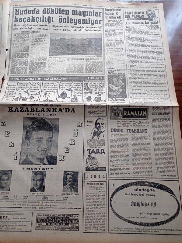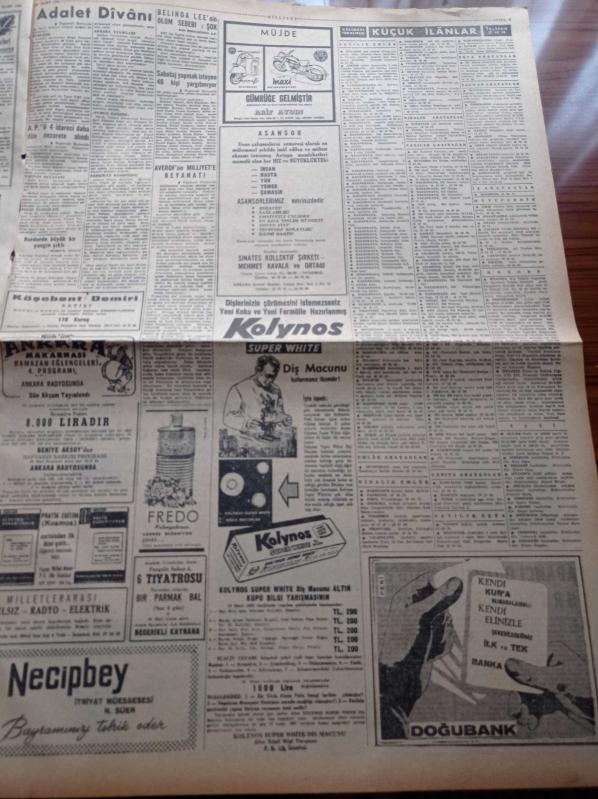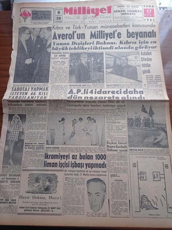 Milliyet Gazetesi - 17 Mart 1961 - Yunan Dışişleri Bakanı Averof'un Milliyet'e Beyanatı - Silahtarağa Fabrikasını Uçurmaya Kalkışan 46 Kişi Yargılanıyor - 16 Mart Şehitleri Anıldı - Adalet Partili 4 İdareci Daha Dün Nezarete Alındı - Başkan Cemal Gürsel Bu Gece Kardeşlik Haftasını Açacak - İkramiyeyi Az Bulan 1000 Liman İşçisi İşbaşı Yapmadı - Çetin Altan Köşe Yazısı - Tarla Kuşu Oyununda Ayla Algan - Bulmaca - Radyo Bugünkü Program - Zeki Müren Kazablanka'da - Sevim Tanürek - Celâl Şahin - Hududa Dökülen Mayınlar Kaçakçılığı Önleyemiyor - Bir Rüzgar Esti Yazan Daniel Gray - Kamil Koç Otobüsleri - Kolynos Diş Macunu - Soğuk Algınlığına Karşı Vicks - Fredo Kolonyası - Galatasaray Beşiktaş Cephesinde Sükunet Var - Basketbolda Darüşşafaka Fenerbahçe'yi Yendi - Kulüpler 9 Bölgede Toto Bayiliği Açıyor - Ordu Takımı Yurda Döndü - Antrenör Önder Dai Kursa Gönderiliyor adlı eser, Kitap > Süreli Yayınlar > Gazeteler > Türkiye > Genel > Günlük kategorisinde İkinci El olarak satıştadır.