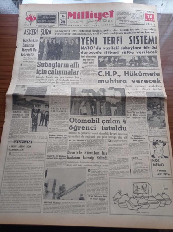 Milliyet Gazetesi - 18 Nisan 1962 - Askeri Şura - Yeni Terfi Sistemi - Başbakan İsmet İnönü Eminsu Heyeti İle Görüştü - Subayların Affı İçin Çalışmalar - Denizcilik Okulu Öğrencileri Derslere Girmedi - Zonguldak Milletvekili Nuri Beşer Bugün Yargılanacak - CHP Hükümete Muhtıra Verecek - Köy Enstitüleri İçin Tören Yapıldı - Çetin Altan Köşe Yazısı - Ankara Orduevi Açıldı - Sülün Osman Huzur'a Kavuştu - Radyo - Bugünkü Falınız - Bulmaca - Yeni Suriye Kabinesi Mutedil Solcu - Galatasaray Liselerde Voleybol Şampiyonu - Türkiye Halter Şampiyonası Adana'da - Spor Toto Müdürlüğü Fazıl Dokaoğlu'nun İddiasını Reddetti - Fenerbahçe Antrenörü Necdet Erdem - Can Bartu Yarın Milli Takıma Karşı Oynuyor - Antrenör Nuri Baytorun İtalya'ya Gitti - Galatasaray Yeşildirek'e Takilmamaya Çalışacak - Darüşşafaka Basketbol Takımı Antrenörü Osman Kermen - Metin Oktay Satılıyor adlı eser, Kitap > Süreli Yayınlar > Gazeteler > Türkiye > Genel > Günlük kategorisinde İkinci El olarak satıştadır.