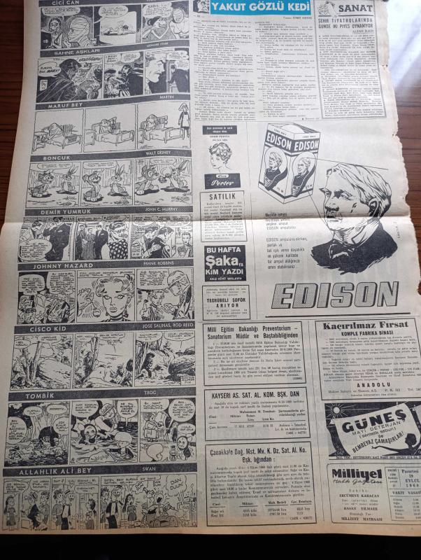 Milliyet Gazetesi - 19 Eylül 1960 - Soruşturma Kurulu İlk Toplantısını Yaptı - Milli Birlik Komitesi Üyesi Numan Esin İhtilal Bir Parti İçin Yapılmadı Dedi - İran Kraliçesi Farah Diba'nın Çocuğu 20 25 Ekimde Doğacak - Başbakanlık Müsteşarı Alparslan Türkeş Polemiğe Girmeyeceğim Dedi - Selim Sarper Dün New York'a Gitti - Suriye Ürdün Sınırında Çarpışma Oldu - Bugünkü Burç Falı - İstanbul Ankara Teknik Üniversite Radyosu Programı - Gördüğüm Rusya Röportaj Ömer Sami Coşar Yazı Dizisi - Abdülcanbaz'ın Maceraları Çizgi Roman Çizen Turhan Selçuk - Şehir Tiyatrolarında Günde İki Piyes Oynanıyor - Yakut Gözlü Kedi Yazan Ümit Deniz Yazı Dizisi - Allahlık Ali Bey Çizen Swan - Tombik Çizen Trog - Cisco Kid Çizen Jose Salinas Rod Reed- Boncuk Walt Disney - Kuzey İtalya Sular Altında - Galatasaray Puan Ve Averajdan Oldu - Beşiktaş Ptt'yi Dün Güç Yendi - Vefa Toto Oynayanlara İzmir'de Şaka Yaptı - Milli Ligde Puan Cetveli - Fenerbahçe'de Adana'da Galip, Ali Naci Karacan tarafından kaleme alınmıştır. Milliyet Gazetesi - 19 Eylül 1960 - Soruşturma Kurulu İlk Toplantısını Yaptı - Milli Birlik Komitesi Üyesi Numan Esin İhtilal Bir Parti İçin Yapılmadı Dedi - İran Kraliçesi Farah Diba'nın Çocuğu 20 25 Ekimde Doğacak - Başbakanlık Müsteşarı Alparslan Türkeş Polemiğe Girmeyeceğim Dedi - Selim Sarper Dün New York'a Gitti - Suriye Ürdün Sınırında Çarpışma Oldu - Bugünkü Burç Falı - İstanbul Ankara Teknik Üniversite Radyosu Programı - Gördüğüm Rusya Röportaj Ömer Sami Coşar Yazı Dizisi - Abdülcanbaz'ın Maceraları Çizgi Roman Çizen Turhan Selçuk - Şehir Tiyatrolarında Günde İki Piyes Oynanıyor - Yakut Gözlü Kedi Yazan Ümit Deniz Yazı Dizisi - Allahlık Ali Bey Çizen Swan - Tombik Çizen Trog - Cisco Kid Çizen Jose Salinas Rod Reed- Boncuk Walt Disney - Kuzey İtalya Sular Altında - Galatasaray Puan Ve Averajdan Oldu - Beşiktaş Ptt'yi Dün Güç Yendi - Vefa Toto Oynayanlara İzmir'de Şaka Yaptı - Milli Ligde Puan Cetveli - Fenerbahçe'de Adana'da Galip adlı eser Türkçe dilindedir.