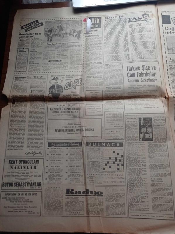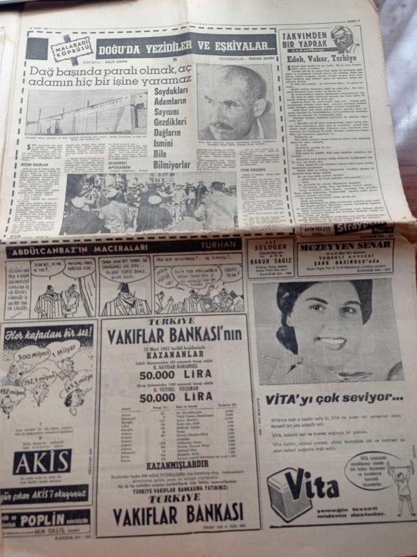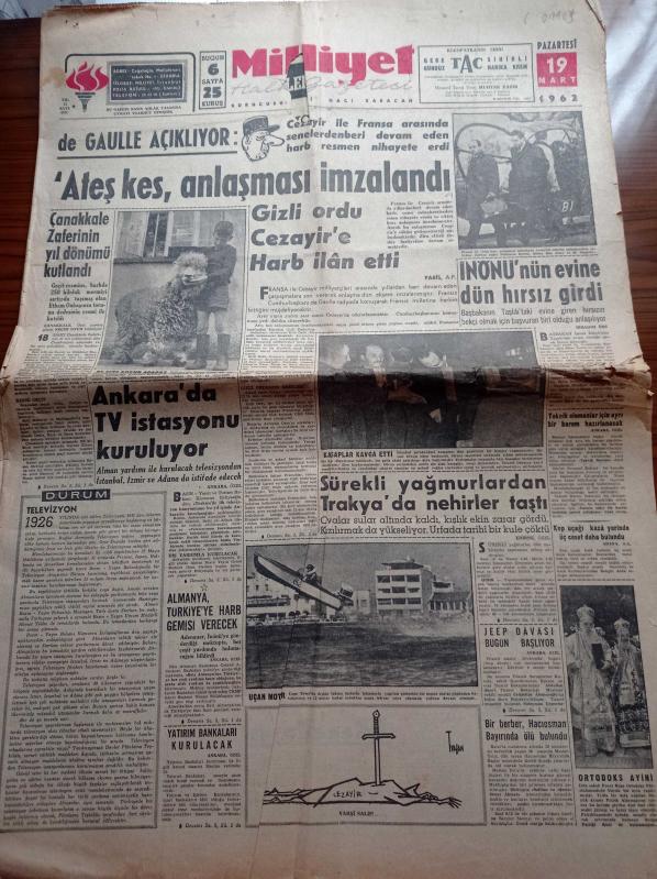 Milliyet Gazetesi - 19 Mart 1962 - Fenerbahçe Şeker Hilali Yendi - Vefa Karşıyaka İle Berabere Kaldı - Can Bartu - Ogün Altıparmak - Selim Soydan - Cezayir İle Fransa Arasında Senelerdir Devam Eden Harp Nihayete Erdi - De Gaulle Açıklıyor Ateşkes Anlaşması İmzalandı - İsmet İnönü'nün Evine Dün Hırsız Girdi - Ankara'da TV İstasyonu Kuruluyor - Fener Rum Ortodoks Patrikhanesinde Ayin - Doğuda Yezidiler Ve Eşkıyalar adlı eser Türkçe dilindedir.