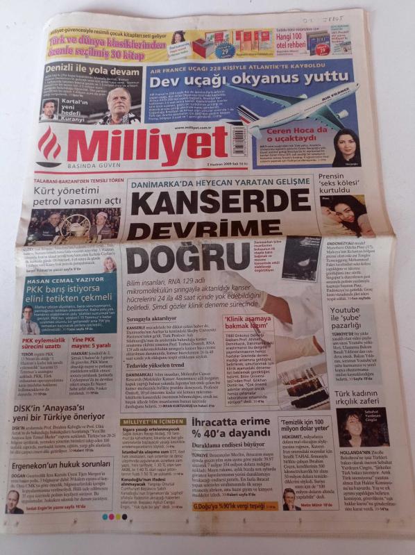 Milliyet Gazetesi - 2 Haziran 2009 - Mustafa Denizli İle Yola Devam - Kürt Yönetimi Petrol Vanasını Açtı - Hasan Cemal PKK Barış İstiyorsa Elini Tetikten Çekmeli - DİSK'in Anayasa'sı Yeni Bir Türkiye Öneriyor - Türk Kadının Irkçılık Zaferi - Kanserde Devrime Doğru - Prensin Seks Kölesi Kurtuldu adlı eser Türkçe dilindedir.