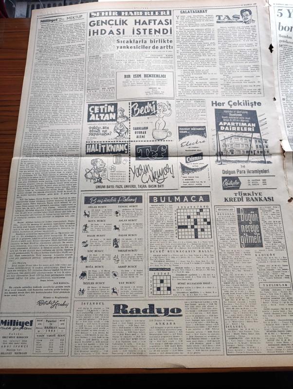Milliyet Gazetesi - 20 Haziran 1960 - Hürriyet Mitingi Ankara'da Yapılıyor - Soruşturma Kurulu Bugün Açıklanacak - Milli Birlik Komitesi 100 Aday Arasından Üyeleri Seçti - Saidi Nursi'nin Risalesini Dağıtırken Yakalanan 7 Nurcu - İsmet İnönü'nün Heykelinin Kaidesi Etrafındaki Tahtalar Söküldü - Galatasaray Lisesi'nin Pilavı - Azot Fabrikası 103 Yerine 470 Milyon Liraya Mal Oldu - Gençlik Haftası İhdası İstendi - Çetin Altan Köşe Yazısı - Bugünkü Burç Falınız - Maliye Vekili Ekrem Alican 5 Yılda 8 Milyar Lira Borç Ödememiz Lazım - Kıbrıs Görüşmeleri Tekrar Başlıyor - Eisenhower Kore'ye Gitti - Yazamadıklarımız Uşak'ta Atılan Taş - Sahne Aşkları Çizen Leonard Starr - Kolynos Diş Macunu - Milli Lig Şampiyonu Beşiktaş Karagümrük'e Takıldı - Çetin Şahiner Yüksek Atlama Rekoru Kırdı - Amatör Futbolcular Beşiktaş Galatasaray Ve Fenerbahçe Tarafından Paylaşıldı - Kürek Yarışlarını Anadolu Hisarı Kazandı - İstanbul Yelken Bayramı Dün Törenle Yapıldı adlı eser, Kitap > Süreli Yayınlar > Gazeteler > Türkiye > Genel > Günlük kategorisinde İkinci El olarak satıştadır.