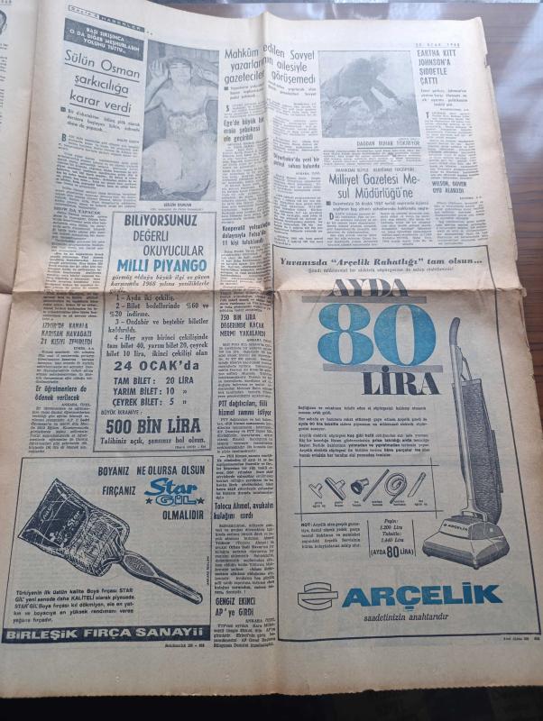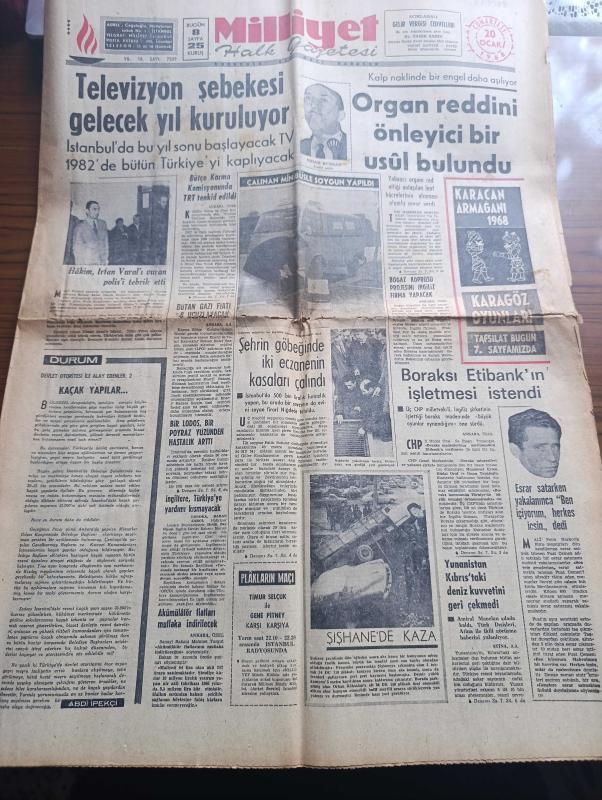 Milliyet Gazetesi - 20 Ocak 1968 - Televizyon Şebekesi Gelecek Yıl Kuruluyor - Devlet Otoritesi İle Alay Edenler 2 Yazan Abdi İpekçi Köşe Yazısı - Kalp Naklinde Bir Engel Daha Aşılıyor Organ Reddini Bir Önleyici Bir Usul Bulundu - Boğaz Köprüsü Projesini İngiliz Firma Yapacak - Boraksı Etibank'ın İşletmesi İstendi - Orhan Kemal'in Yalova Kaymakamı Piyesi Ulvi Uraz'ın Tiyatrosunda Büyük Bir Başarı Kazandı - Sülün Osman Şarkıcılığa Karar Verdi - Alptekin Viyana Delisi Yazan Ahmet Kozanoğlu Çizen Abdullah Turhan - Abdülcanbaz'ın Maceraları Çizen Turhan Selçuk - Sokaklardan Bir Kız Yazan Orhan Kemal Yazı Dizisi - Çağın En Büyük Cinayetleri Yazan Kurt Singer Yazı Dizisi - Karagöz Armağanı 1968 - İstanbul'un İlginç Gece Kulüplerinden Viski A Go Go Fotoğraf - Durul Gence - Dormen Sanatçıları Büyük Kaza Atlattı - Ahmet Berman'a Sessiz Jübile - Can Bartu'nun İtalya'da Ameliyat Oluşu Senatoda Tartışıldı - Ankaragücü Trafik Kazası Geçirdi - Beşiktaş Stadı 30.000 Kişi Olacak - Muhammed Ali Clay