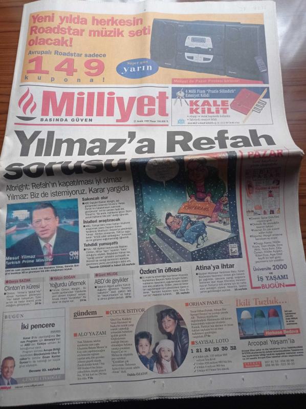 Milliyet Gazetesi - 21 Aralık 1997 - Mesut Yılmaz'a Refah Partisi Sorusu - Sibel Can Çocuk İstiyor - Anayasa Mahkemesi Başkanı Yekta Güngör Özden'in Öfkesi - Orhan Pamuk - Yeşim Salkım - Franco Nero Atatürk Olmayı Bekliyor adlı eser, Kitap > Süreli Yayınlar > Gazeteler kategorisinde İkinci El olarak satıştadır.